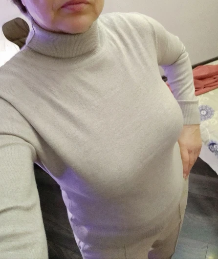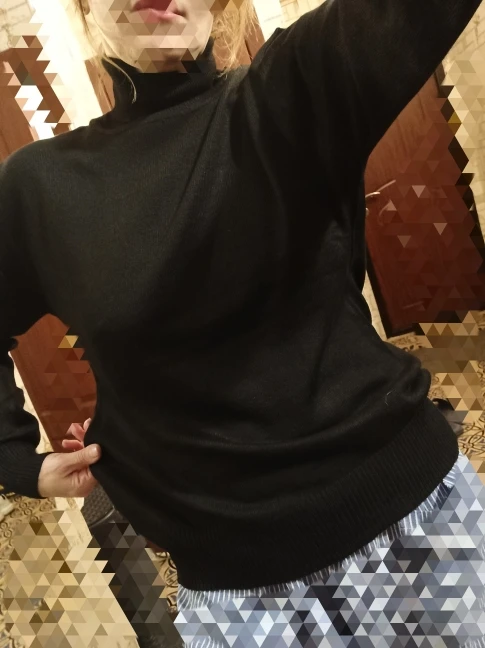 Ничего кашемирового в гольфике нет. Мягкий, вязаный, но ничего общего с фото. Состава на бирке нет, как и самой бирки, есть только этикетка производителя.на ОГ98, об98 размер xl. Не в облипку, свободно, по плечам идеально.