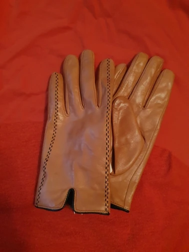 Перчатки мягкие, внутри тонкая меховая отделка. Качественные, из натуральной кожи. Размер L подошёл на большую руку (обычно ношу 9,5). Цвет не оранжевый, а светло-средне-коричневый, то что по-английски называется tan. Для сравнения фото на оранжевом фоне (на фото получилось ярче).