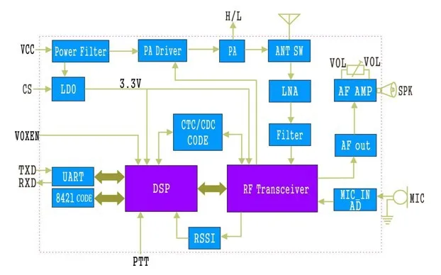 1ppm TCXO Встроенный EEPROM, данные сохраняют даже выключение питания Выбор высокой/низкой выходной мощности (500 МВт-1 Вт) 8 кВ * 166 CDCSS, 38 CTCSS Высокая интегрированная с ультра малым размером Высокая чувствительность: -124dBm 3 ~ 5 км Расстояние в открытом аере 1 Вт Выходная мощность * 12,5/25 кГц выбор полосы пропускания Исключительно частота TX и RX Частотный диапазон: 134-174 МГц
