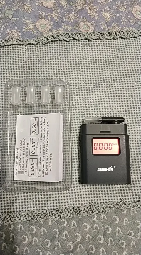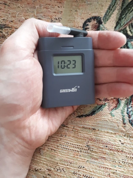 Качественная упаковка. Есть 4 запасных мундштука. Очень удобный. Есть часы на экране Можно носить с собой. Для работы нужны 2 батарейки ААА. Инструкция на английском, но и так понятно, как пользоваться.Справа кнопка запуска. Идет отсчет (калибруется на 0), после сигнала дуешь. Если по нулям, то результат выйдет раньше без сигнала. Если есть алкоголь, то запищит. Причем есть допуск 0,250 мг на литр. Если меньше, то просто выведет результат. Если больше, то кричит сильнее. В РФ макс 0,355мг/л. Сначала продул для проверки - 0. После тестировал с пивом (полкружки и сразу дул). На фото показывает единицы измерения BAC. Надо нажать 2 раза на кнопку, чтобы поменять измерение на мг/л. После запоминает и дальше уже показывает эти единицы. Не знаю, на сколько точно, но предупреждение все равно ниже порога будет. После продувки проверял на ребёнке))), мало ли остаются пары и будет врать. Но нет, все нормально по 0! Продавцу спасибо за оперативность.