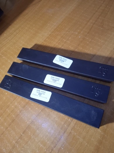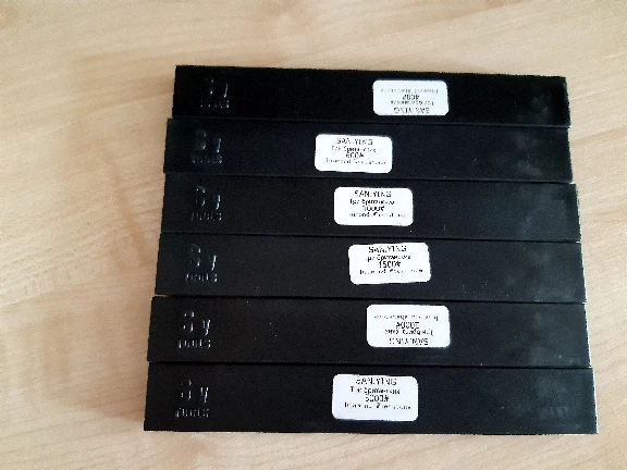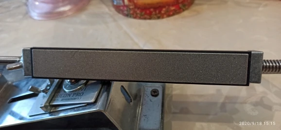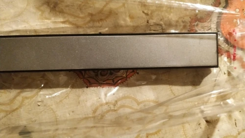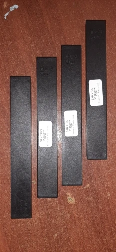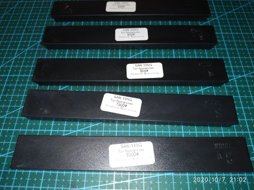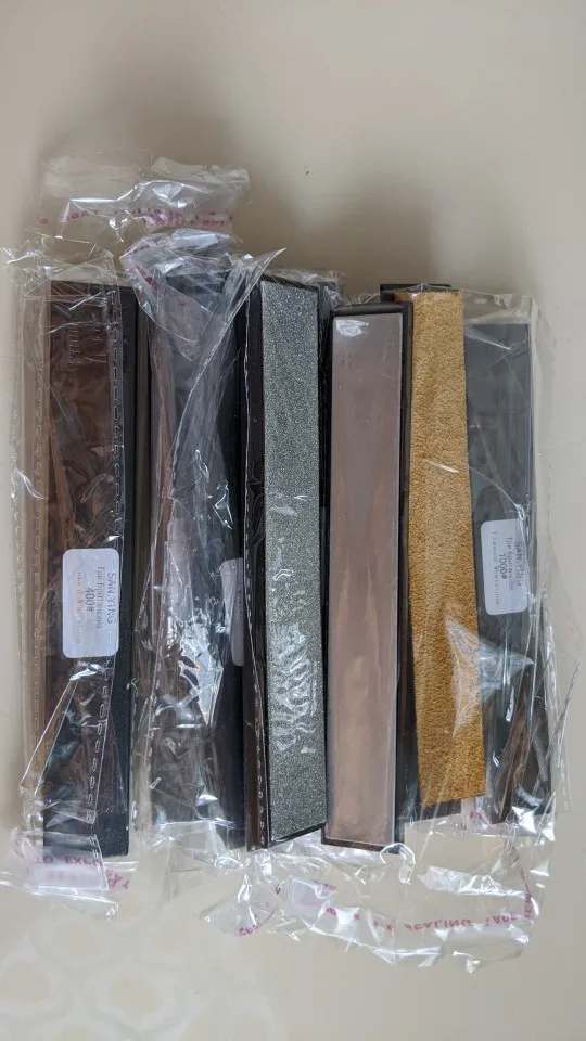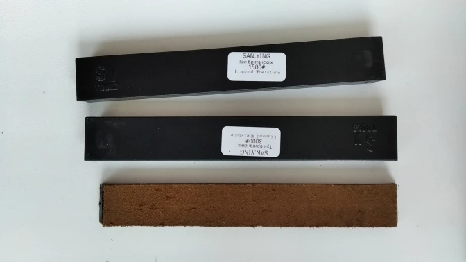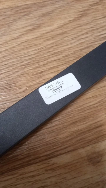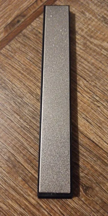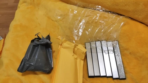 Бруски (400, 1500, 3000) как в описании пришли в сборной посылке на кассу в Пятёрочку. Доставка три недели, вполне устроила. Пробовал точить кухонные ножи без станка вручную, очень доволен, точат не плохо. Состоят из пластиковой основы, на которую наклеена полска металла 1 мм с алмазным напылением. Один брусок 3000, плохо проклеен, имеется горбушка, на фото. Если со временем сама не отвалится, то срежу и переклею. Остальные ровные, без изъянов. Свою цену стоят. С продавцом не общался, спор по бруску не открывал, закажу ещё каких нибудь других по гритности.