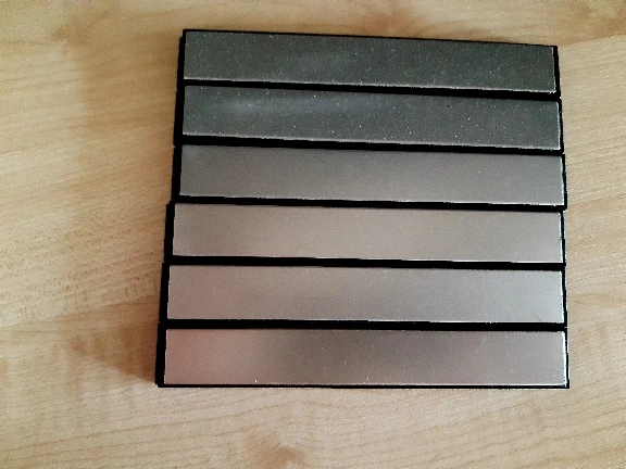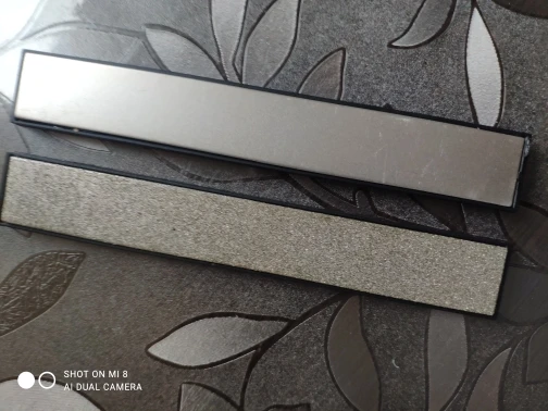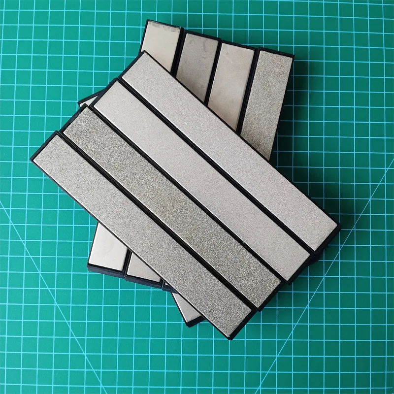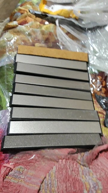 Товар соответствует описанию.Бруски ровно приклеены к пластику, но на паре есть небольшие царапины, но на заточку не влияет. Заточил ими несколько ножей, напыление держится хорошо. Продавца и товар рекомендую.