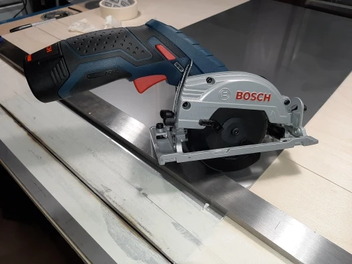 Брал для аккумуляторной циркулярки Bosch 12v, чтобы иметь возможность делать ровные пропилы. И я получил что хотел! Диск встал почти идеально и сам себя откалибровал за пару мм пропила. Получил идеально ровный рез по нержавейке. Для примера прикладываю фото сточившегося диска - 35 см нержавейки толщиной 1.5 мм. Нагрузка на пилу намного больше, чем при пилении дерева - аккумы высаживаются раз в 5 быстрее. Но выдаваемых 1400 оборотов в минуту вполне хватает для уверенной работы. Лобзиком такого ровного реза получить не удалось.