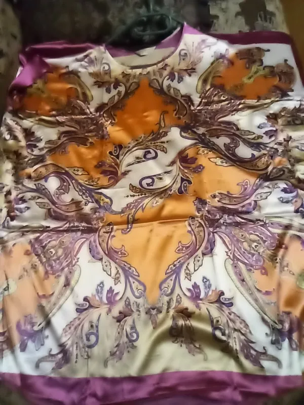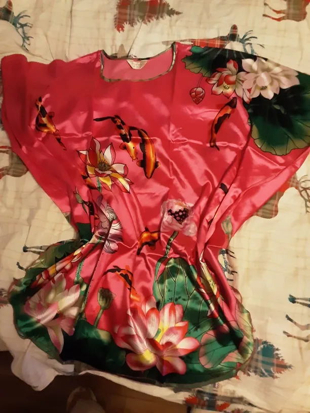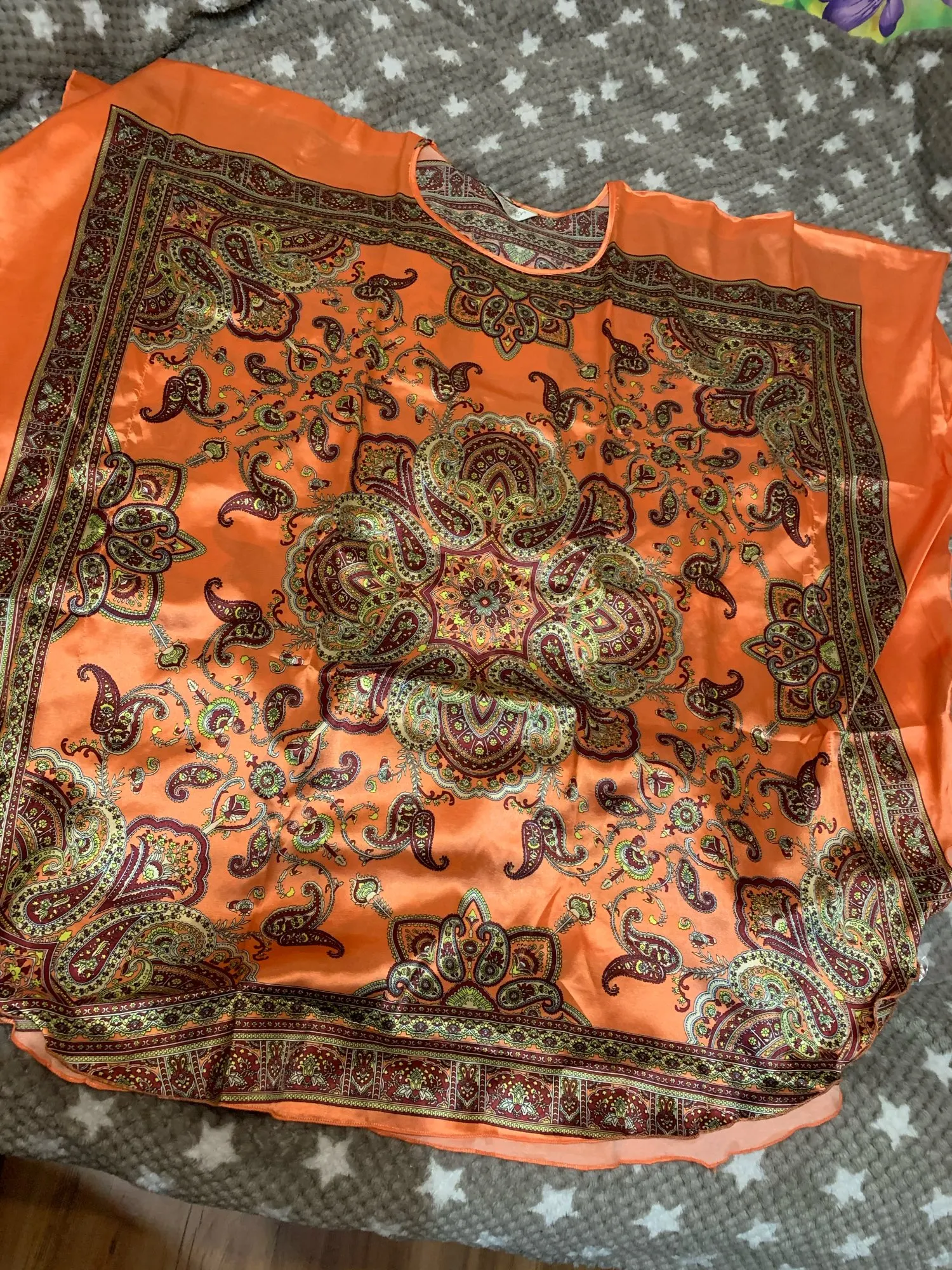 Странно, что в отзывах писали на 54 размер. Я и купила для тети. Придётся носить самой. У меня 48-50, в самый раз. Ткань шелковистая, приятная, сильно электризуется, что устраняется антистатиком. Удобная и красивая вещь для дома