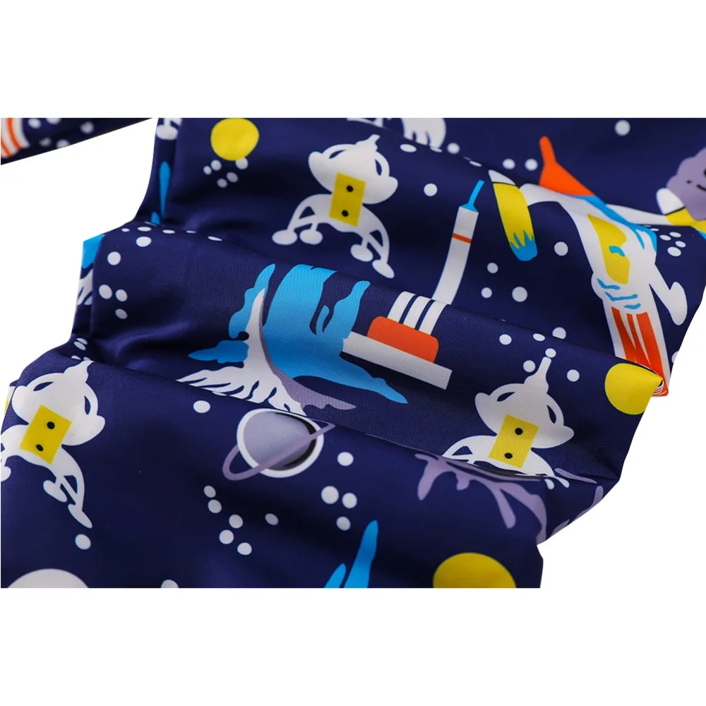 Большущее спасибо продавцу за такой классный костюмчик. заказала размер 6, на этикетке размер 130. этот размер идёт на европейский 98-104, ребёнку 3,5 года в самый раз. ткань хорошая завтра будем одевать и напишу промокает или нет. за такую цену можно смело заказывать