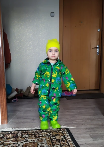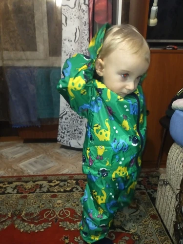Костюм хороший. На мой взгляд не хватает резинки у капюшона. Брала на 2 размера больше, есть запас, за счёт резинок на рукавах и штанах сидит хорошо, носить можно уже сейчас. Ребёнку 1,9г. Рост 82, вес 10900