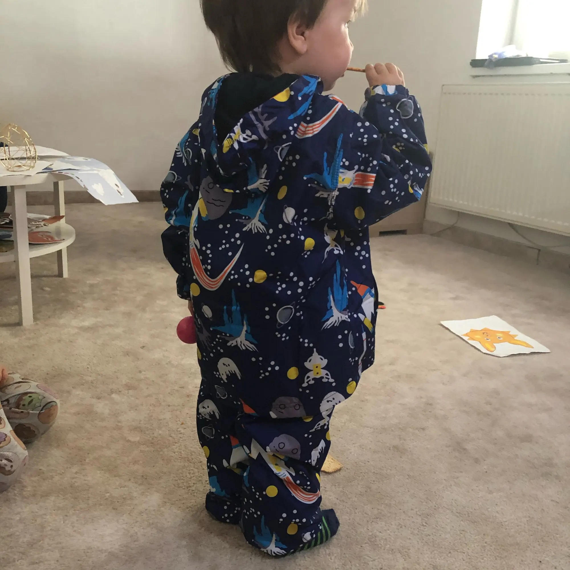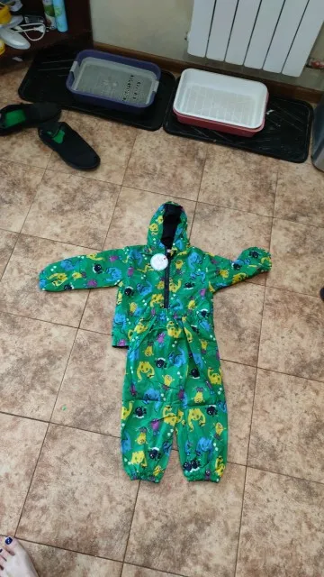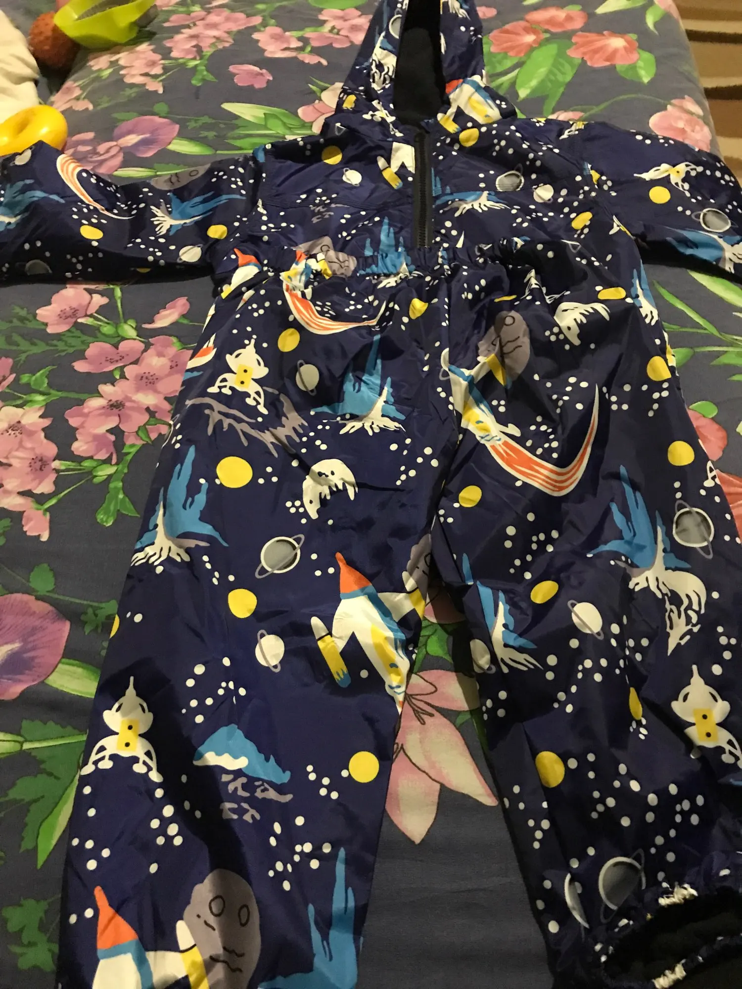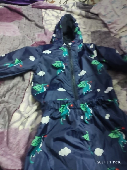 пришёл костюм быстро, отслеживался. пошито аккуратно. брали 110,хотя у ребенка рост 92.,и не прогадали. костюм немного маломерит и думаю на размер110 будет маловат. а так на сезона два точно хватит. капюшон пошит не правильно-мелкий. присутствует хим. запах. в целом костюм за свои деньги отличный, если подгадать с размером.