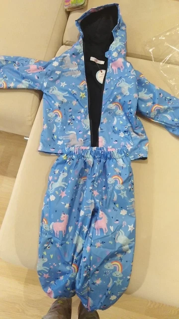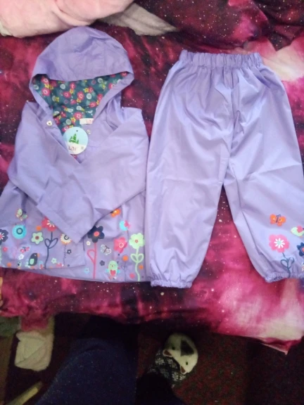 покупала в подарок, сейчас не могу сказать о соответствии размеров. внешний вид очень приличный, нитки не торчат. костюмчик на дождливую погоду осени или весны
