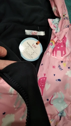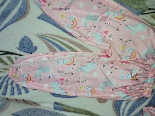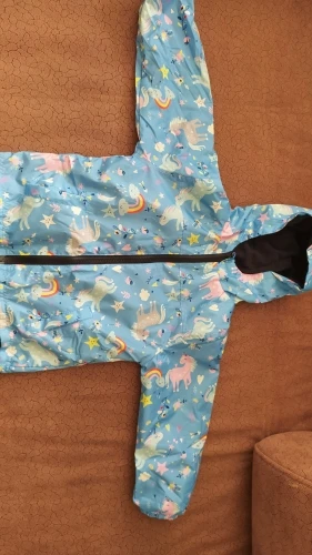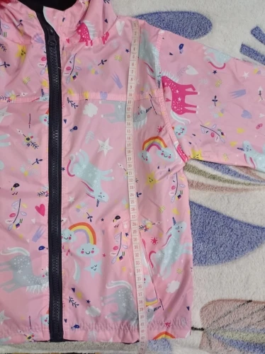 Качество хорошее, цвет как на картинке. Ткань-двойная плащевка, внутри менее плотная, снаружи плотнее. Интересно, как рисунок поведет себя после стирки. Жаль, что нет резинки на манжетах. По размеру не сориентирую, брала на вырост, на дождливые дни лета. Дочь сейчас 72см, ей конечно большой.