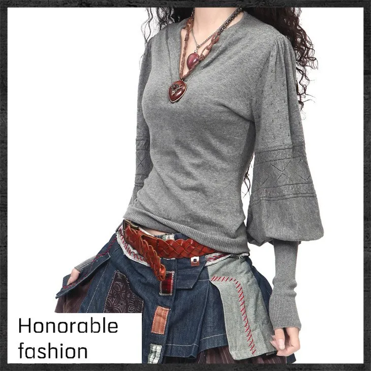 Новый женский свитер с V-образным вырезом, пуловер с рукавами-фонариками, вязаный черный женский свитер