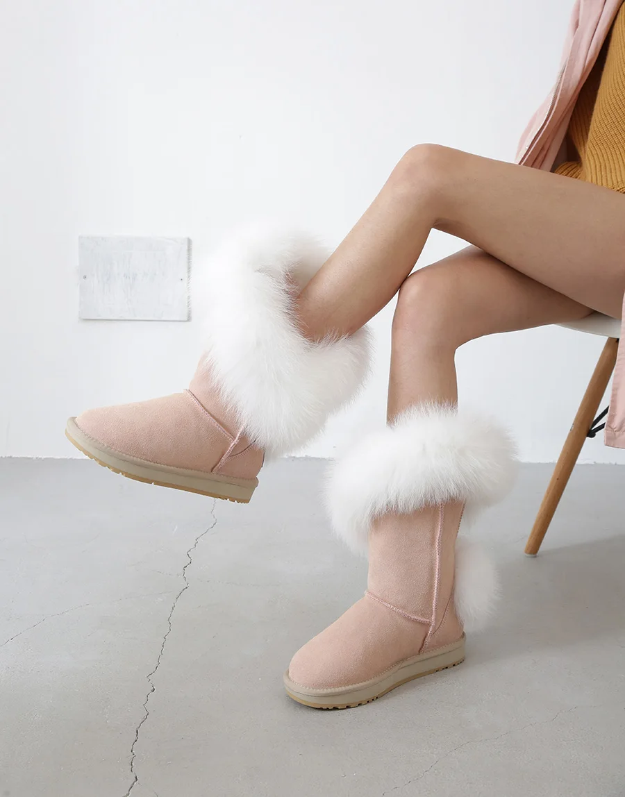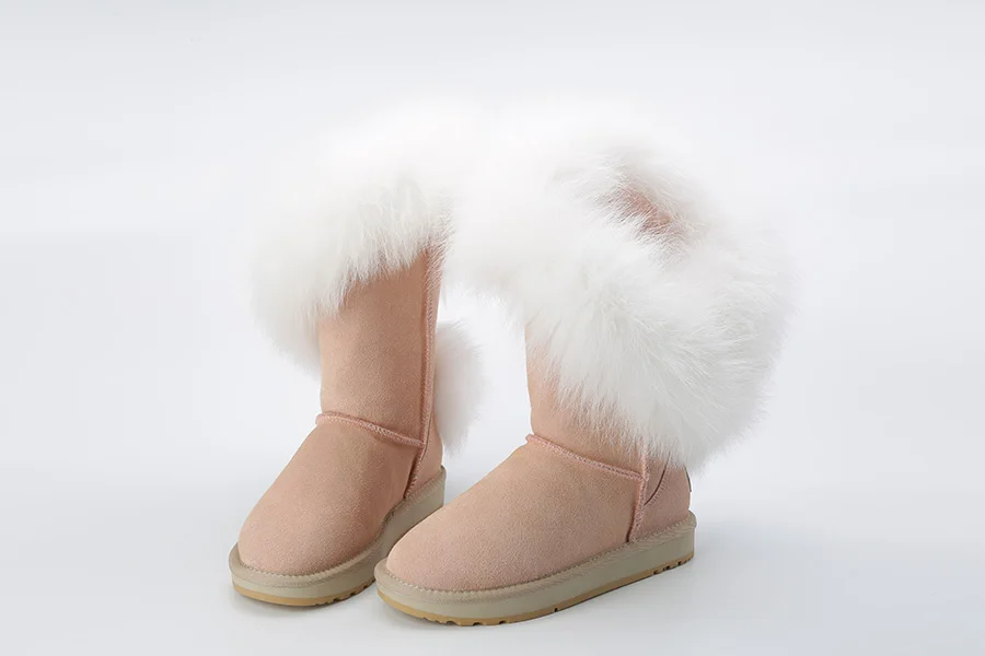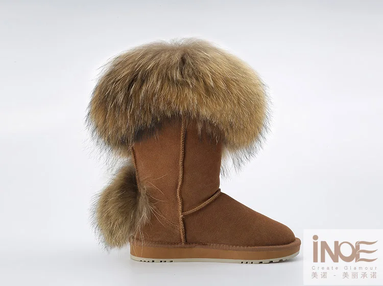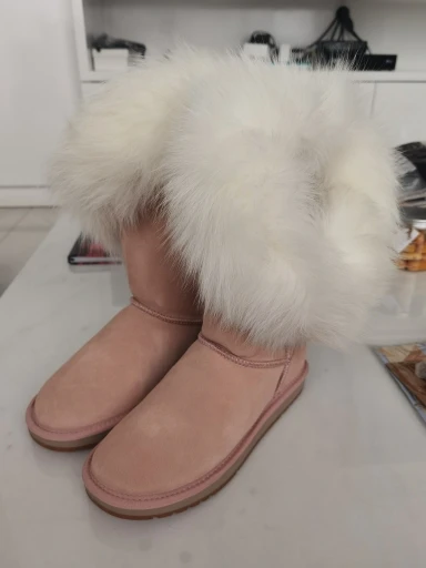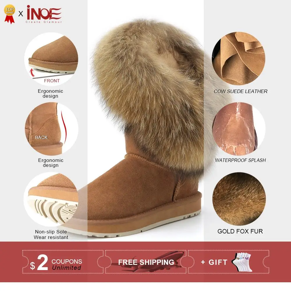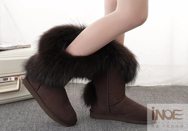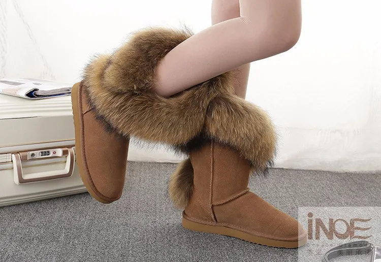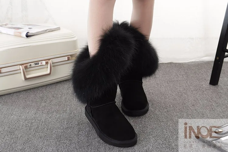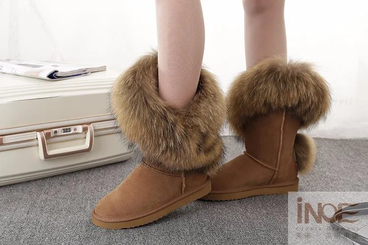 Материал верха: натуральная коровья замшаМеховая отделка: натуральный лисьий мехВнутрений материал: высококачественный синтетический мехВысота голенища: около 30 см (от подошвы до верха)Производитель: INOEВысокое качество!Подошва: Новая нескользящая подошва