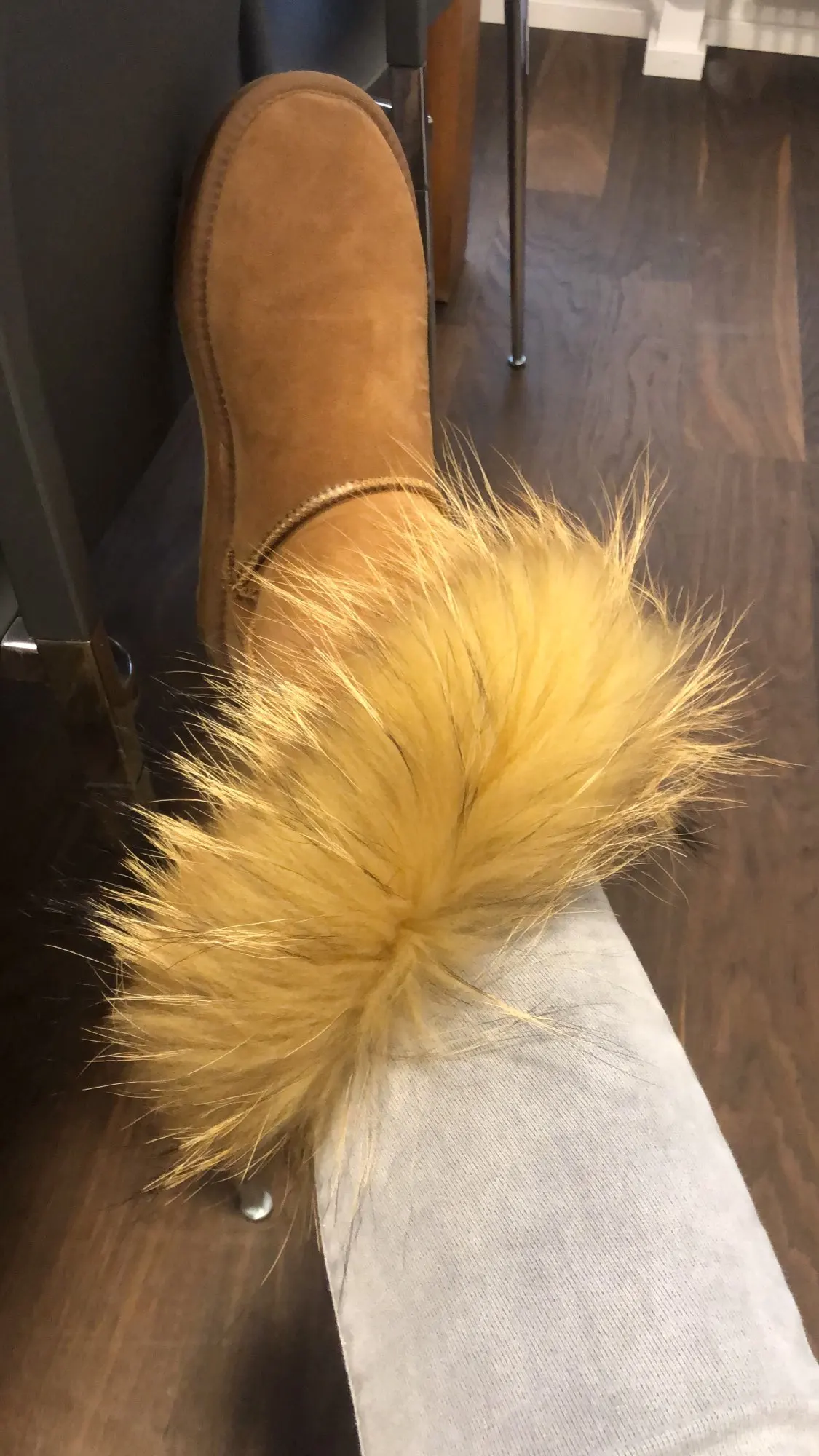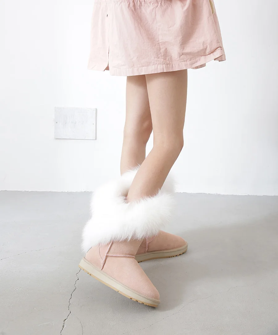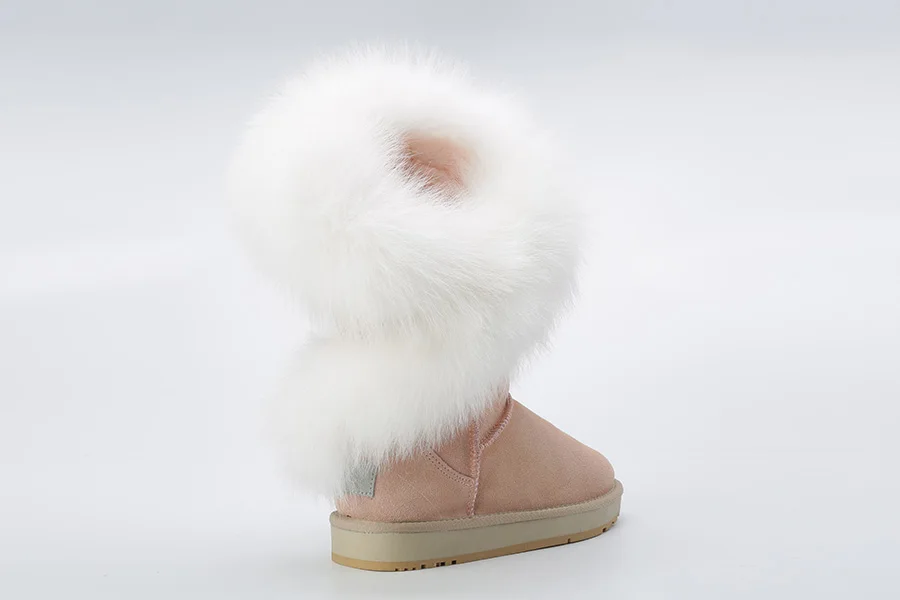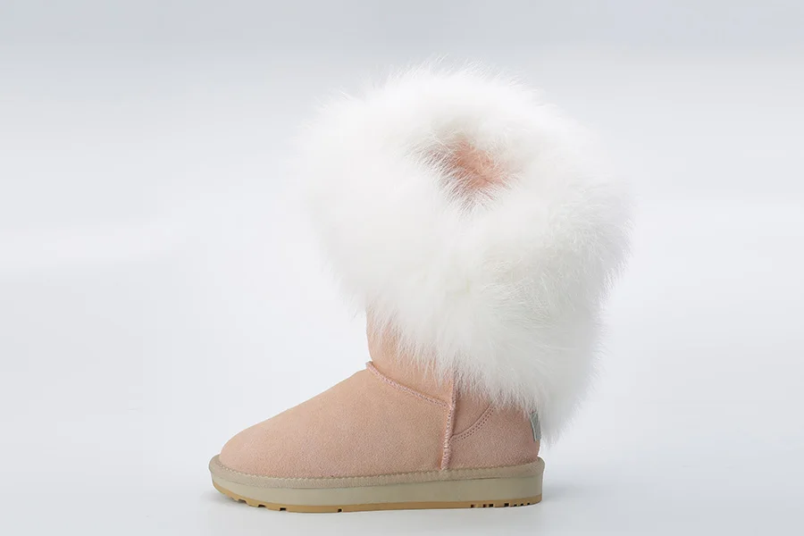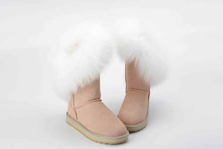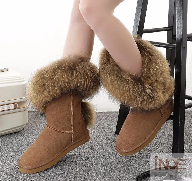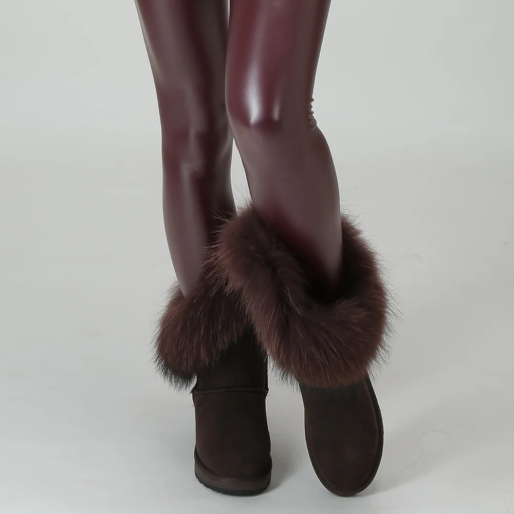 Материал верха: натуральная коровья замшаМеховая отделка: натуральный лисьий мехВнутрений материал: высококачественный синтетический мехВысота голенища: около 30 см (от подошвы до верха)Производитель: INOEВысокое качество!Подошва: Новая нескользящая подошва