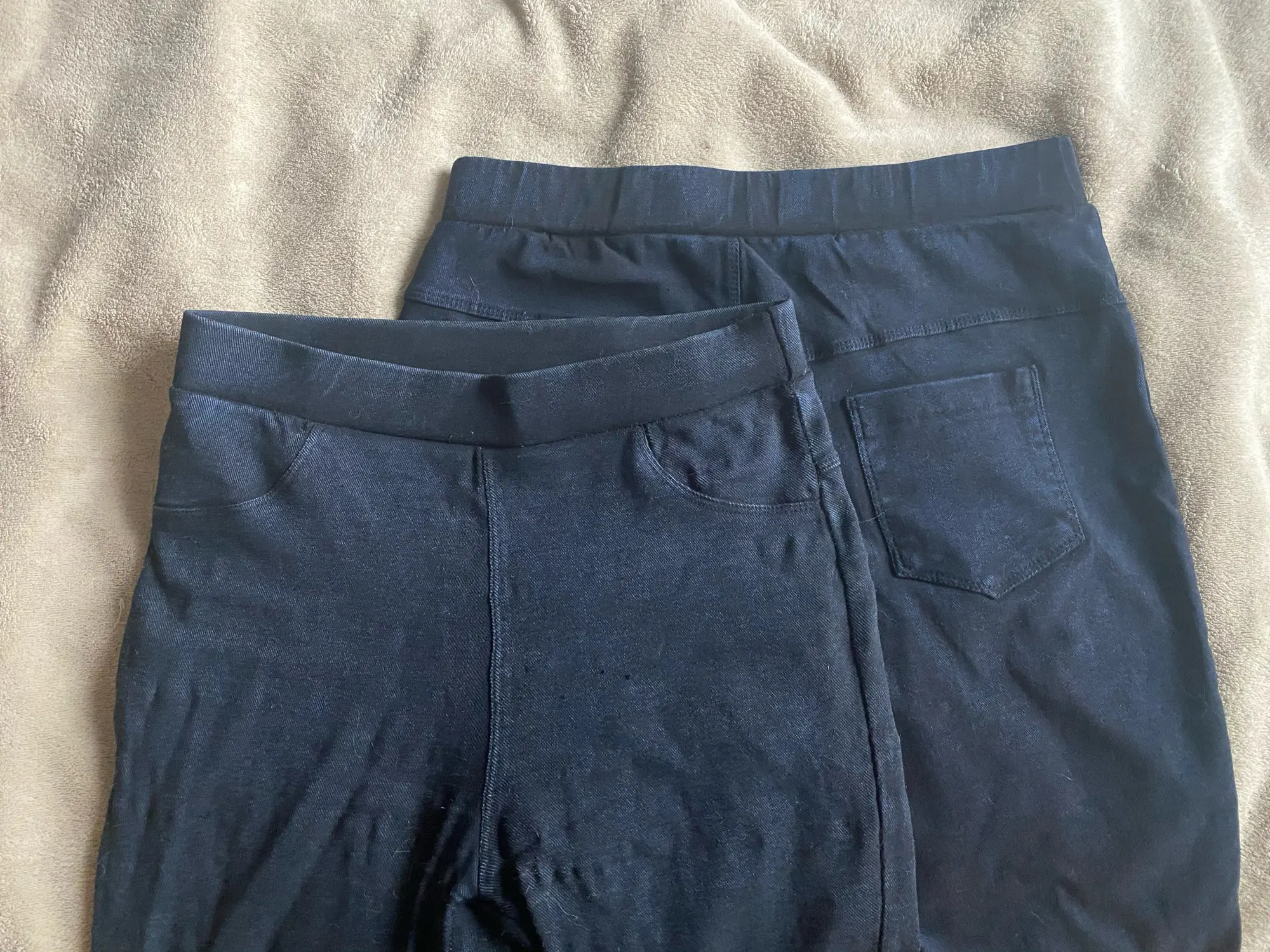 Часто покупаю такие штанишки. На бёдра 95 в этот раз М чуть свободно. Можно было и меньше брать. Раньше М были меньше - на фото старые и новые. Качество отличное. Фабричное. Плотные джегинсы. На фото старые и новые . Старым больше 2 лет - отличные в постоянной носке. Только потом от стирок на попе вылезают резиночки мелкие. Но я их постоянно ношу и стираю. Не каждые джинсы из магазина столько выдержат как эти. Отличная покупка.