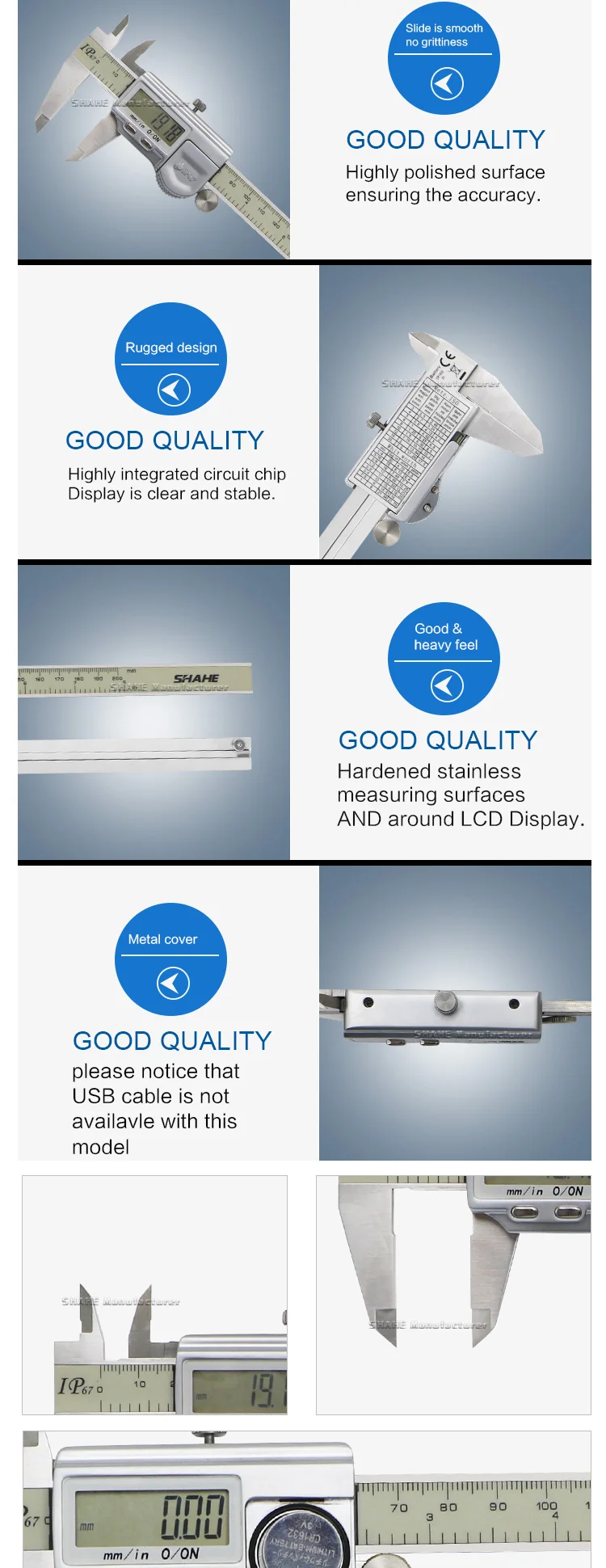 1. Водонепроницаемый IP67, закаленная Нержавеющая Сталь Основные весы и измерительные челюсти2. Ролик тонкой регулировки и накатанный запорный винт для более удобного измерения и чтения3. Относительный/абсолютный обмен измерений в любом положении4. Высококачественная стеклянная фиксированная сетка, стабильная, прочная и высокая точность5. Быстрый дисплей измеряемого значения на ЖК-экране, отсутствие ошибки в скорости6. Две функциональные кнопки с лезвием для измерения глубины7. С кнопкой включения-выключения, автоматическое выключение8. Нулевая Настройка в любом положении, конвертация измерительной системы мм/дюйма9,3 В CR1632 экологический аккумулятор, срок службы батареи> 1 год10. Измерение для ID, OD, глубины и измерения шага
