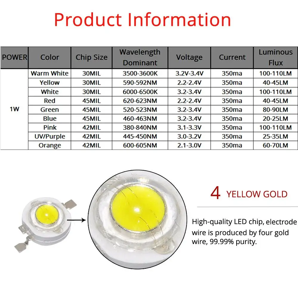 Желтый: Длина волны (590-595нм): прямое напряжение постоянного тока: 2,2 В ~ 2,6 В; Световой: 40-50 лм.