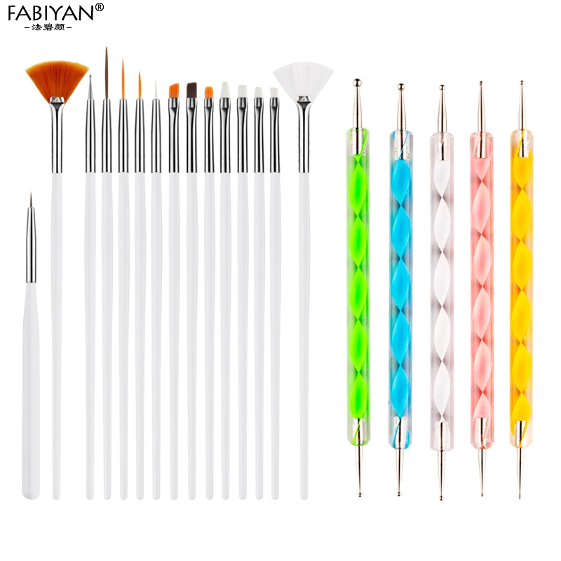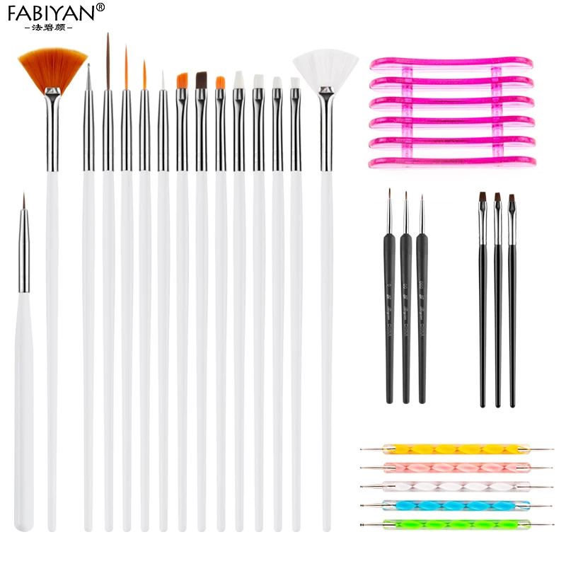 В комплект поставки входят: 1 Комплект Щетка для ногтей +Держатель для ручки Бесплатные (5 шт.Инструмент для нанесения точек+ 15 шт. Кисть для ногтей+ 3 предмета в комплектеКисть для ногтей + 3 шт Кисть для ногтей плоская)
