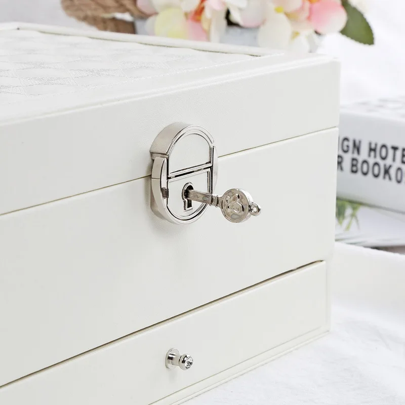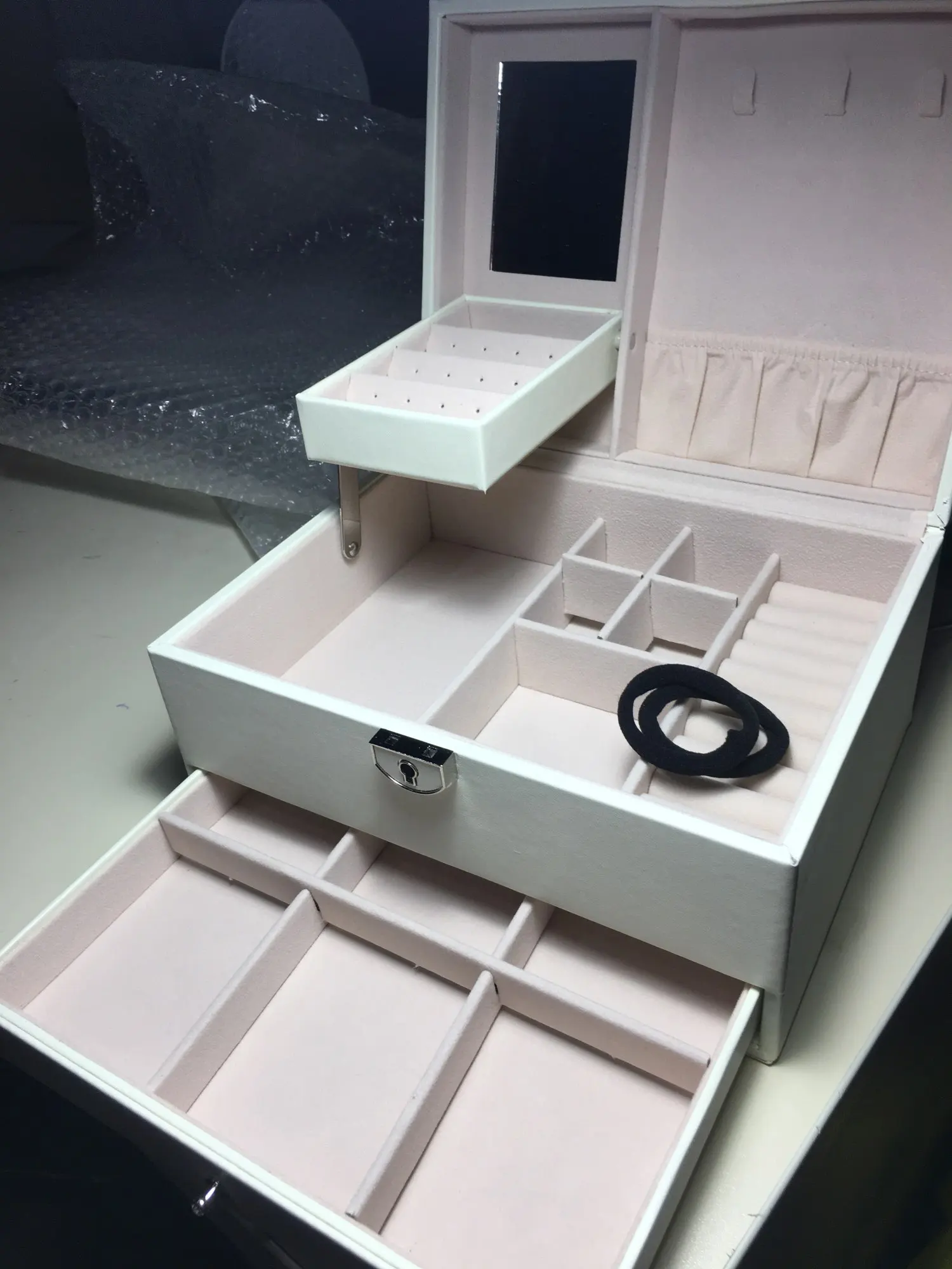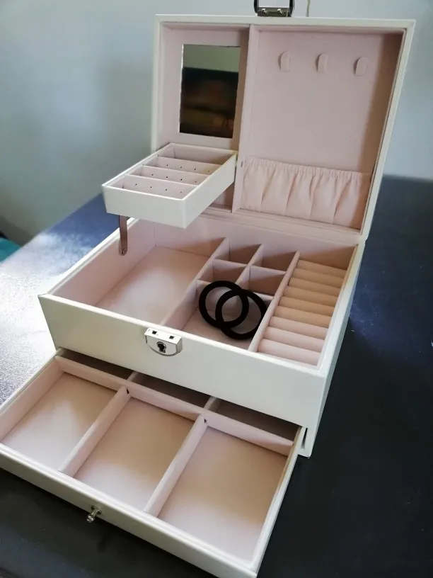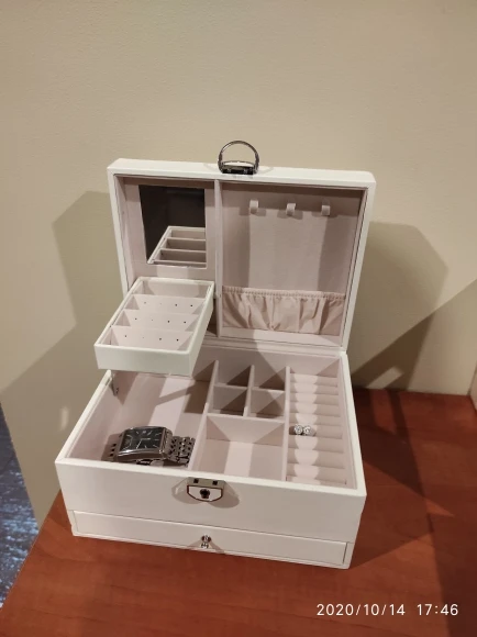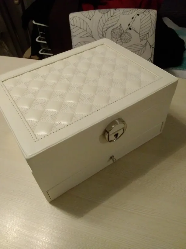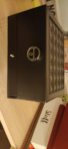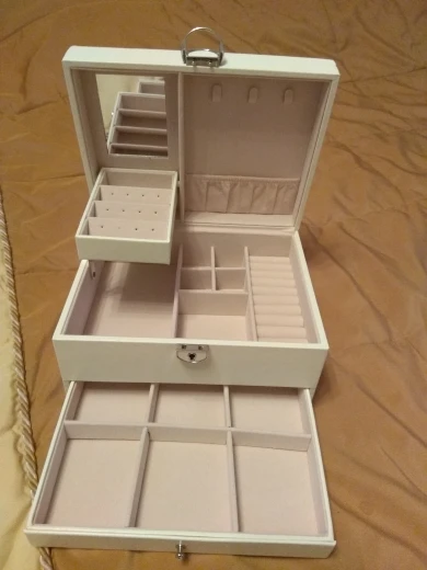 très belle boîte, je l'adore, elle est élégante et de qualité à un détail près : la serrure ne fonctionne pas mais je ne comptais pas la fermer à clef de toute façon et pour le prix je ne vais pas m'en plaindre. Les casiers dans le tiroir du bas bouge légèrement, ce n'est pas gênant mais c'est parce qu'on peut les retirer pour avoir un tiroir entier. Parfaite.