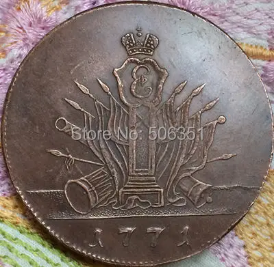 На фото копия изображена состаренной, в действительности же монета блестит ярко-желтой медью