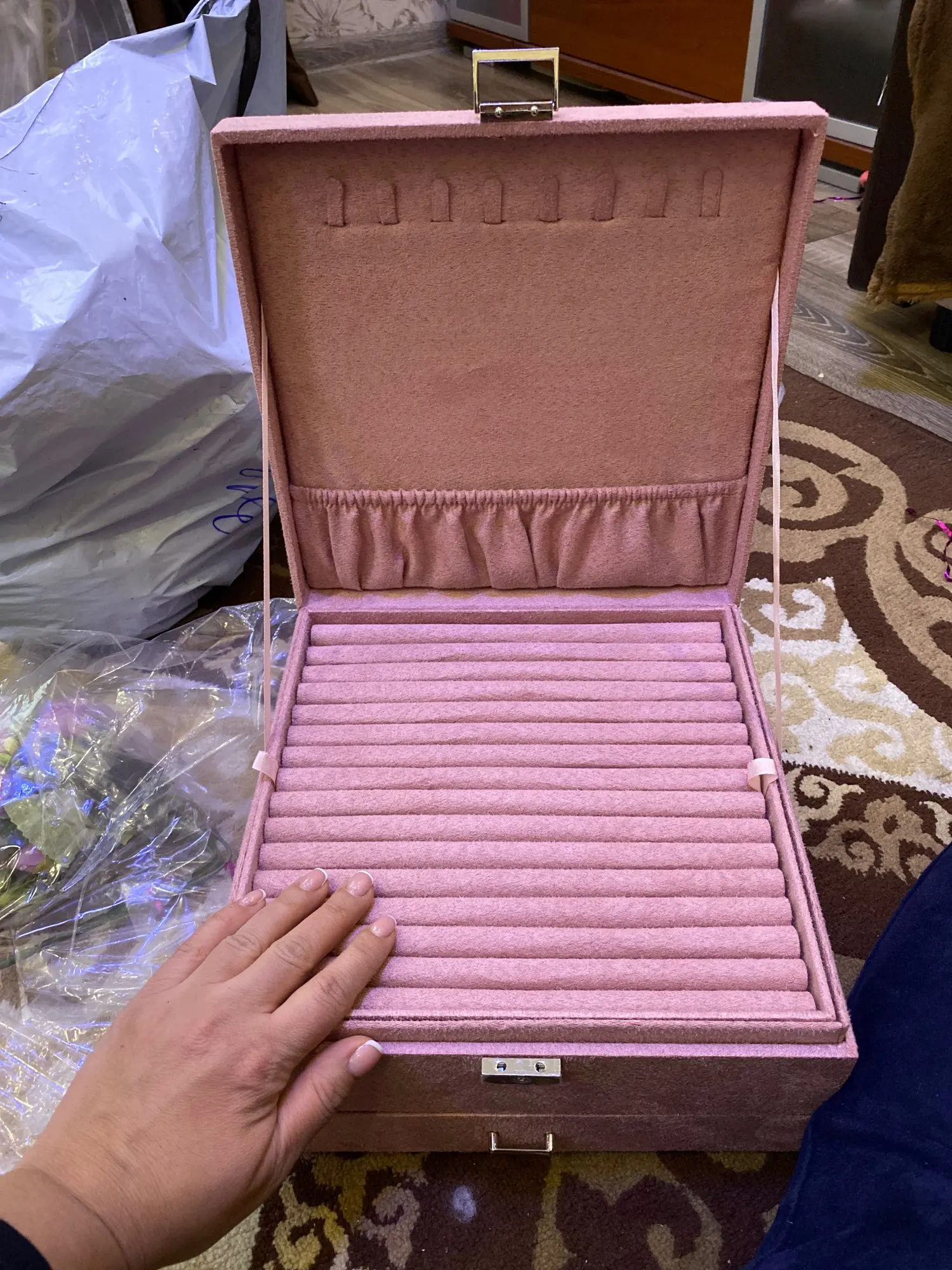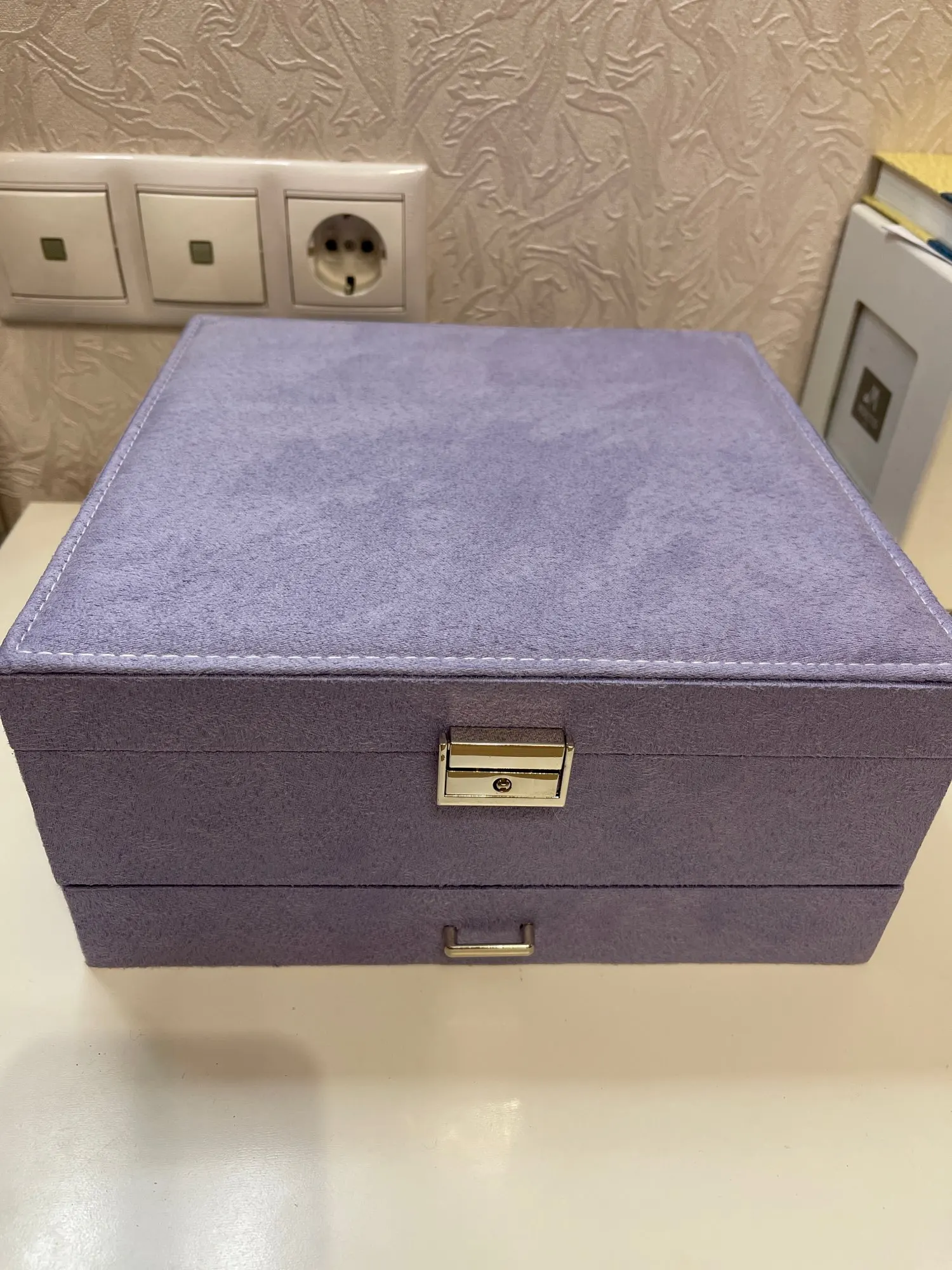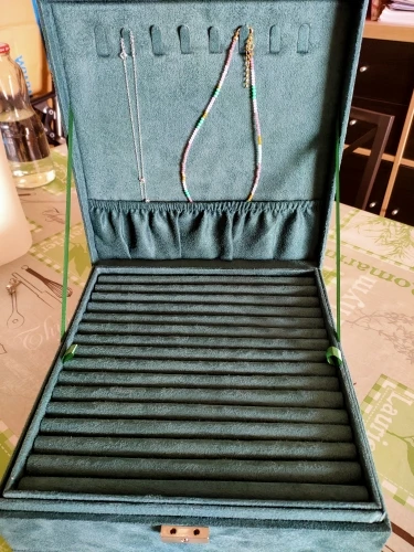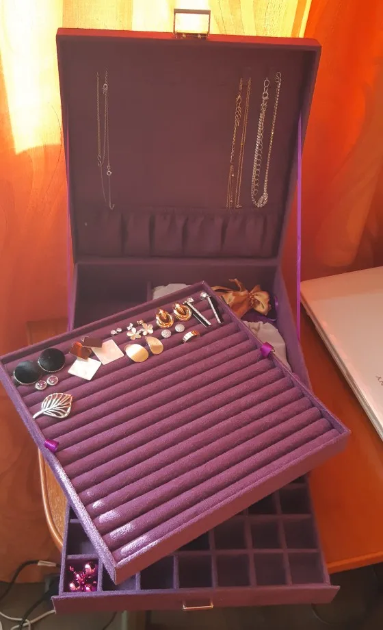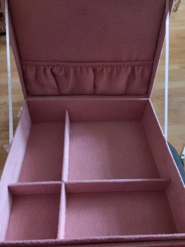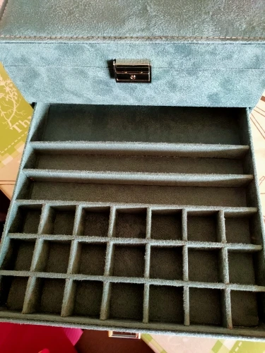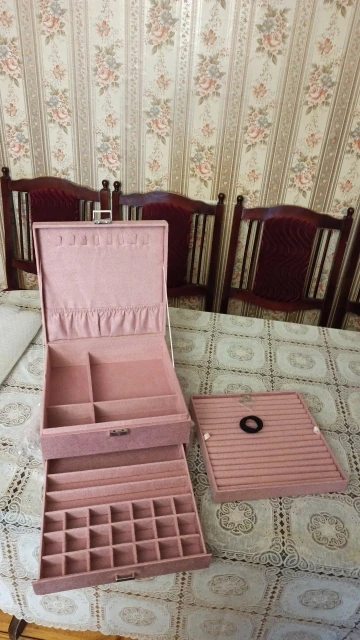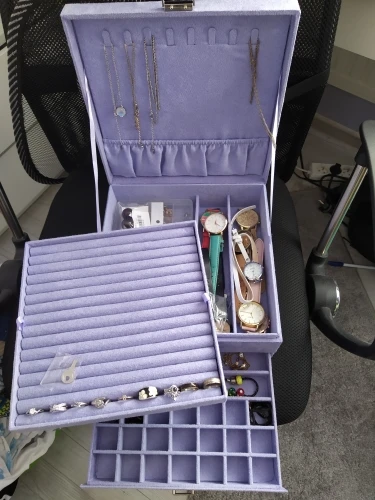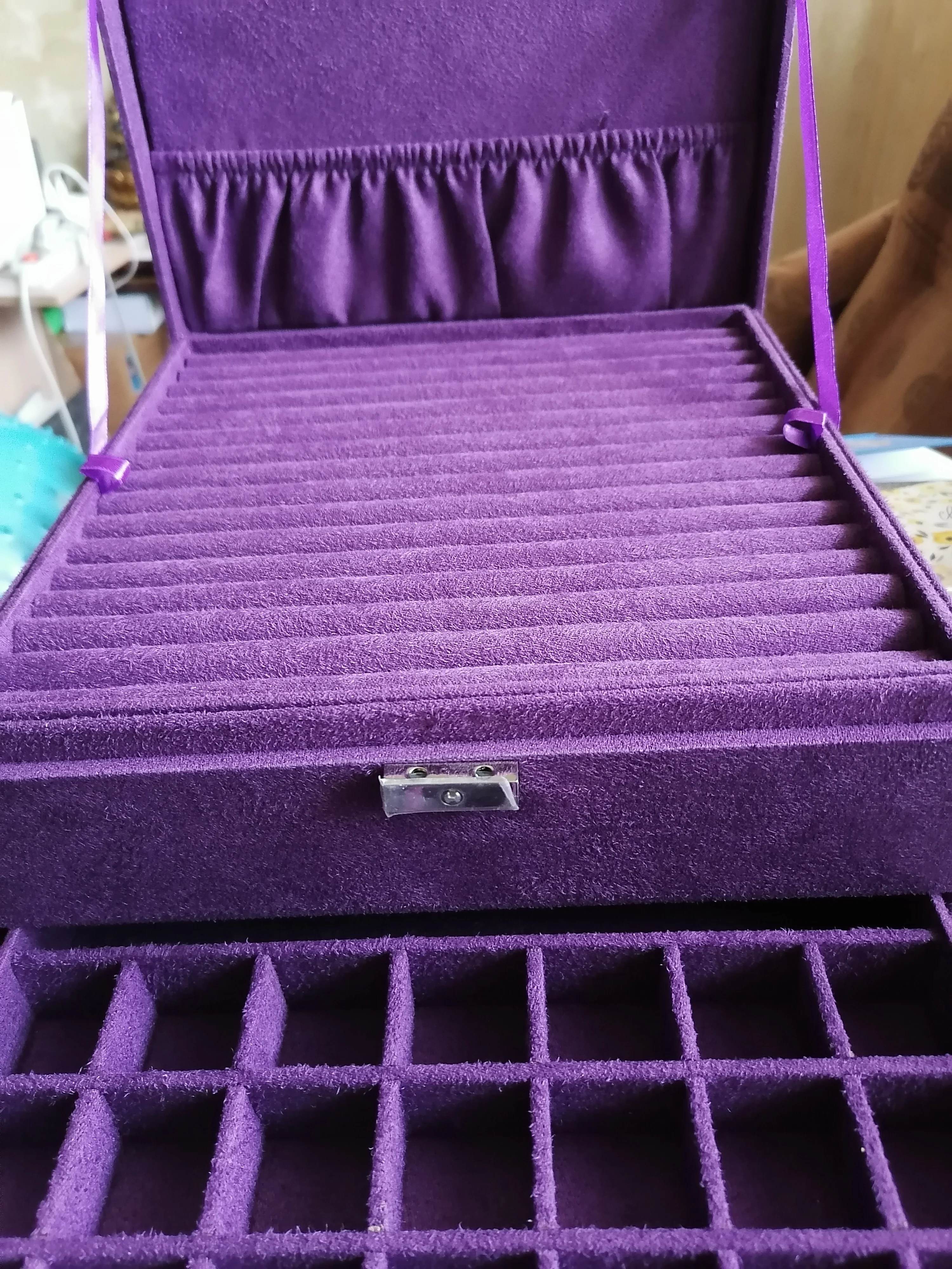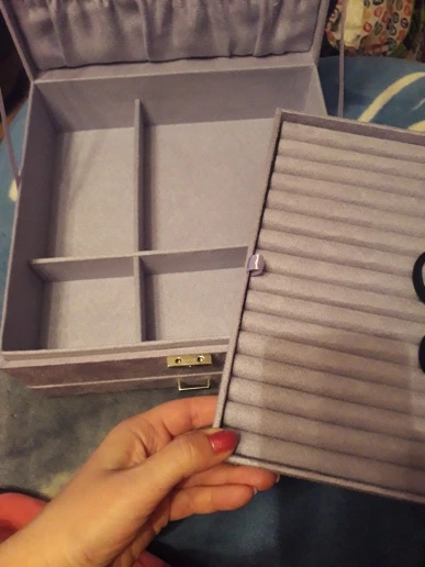 Шкатулка для украшений очень вместительная и может хранить много ювелирных изделий. Материал-не лучшее качество, бархат не ощущается роскошно. Но это делает свою работу, особенно за эти деньги.