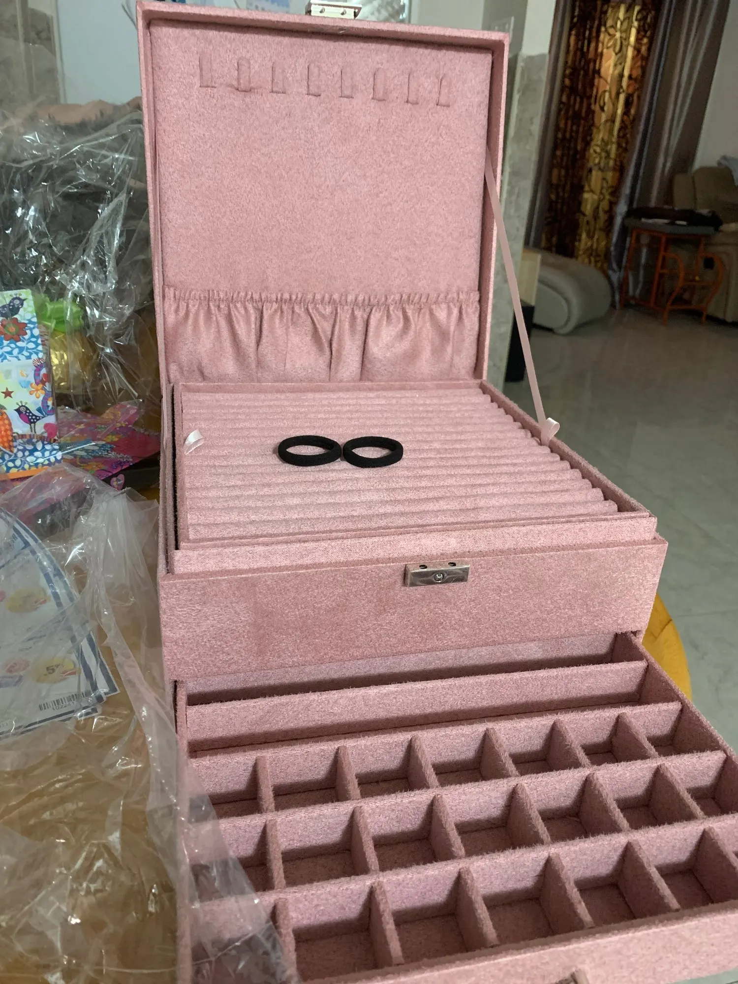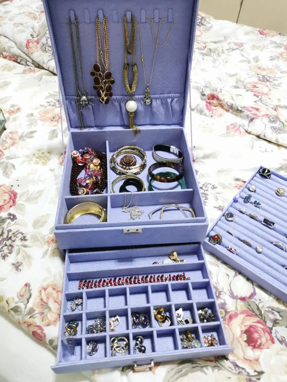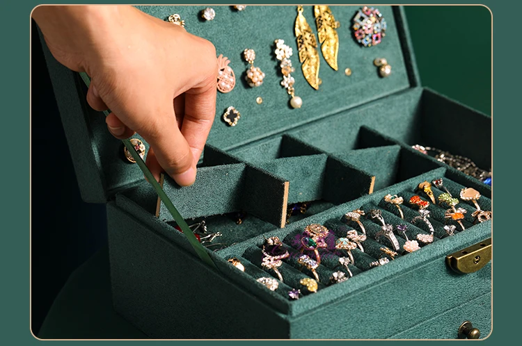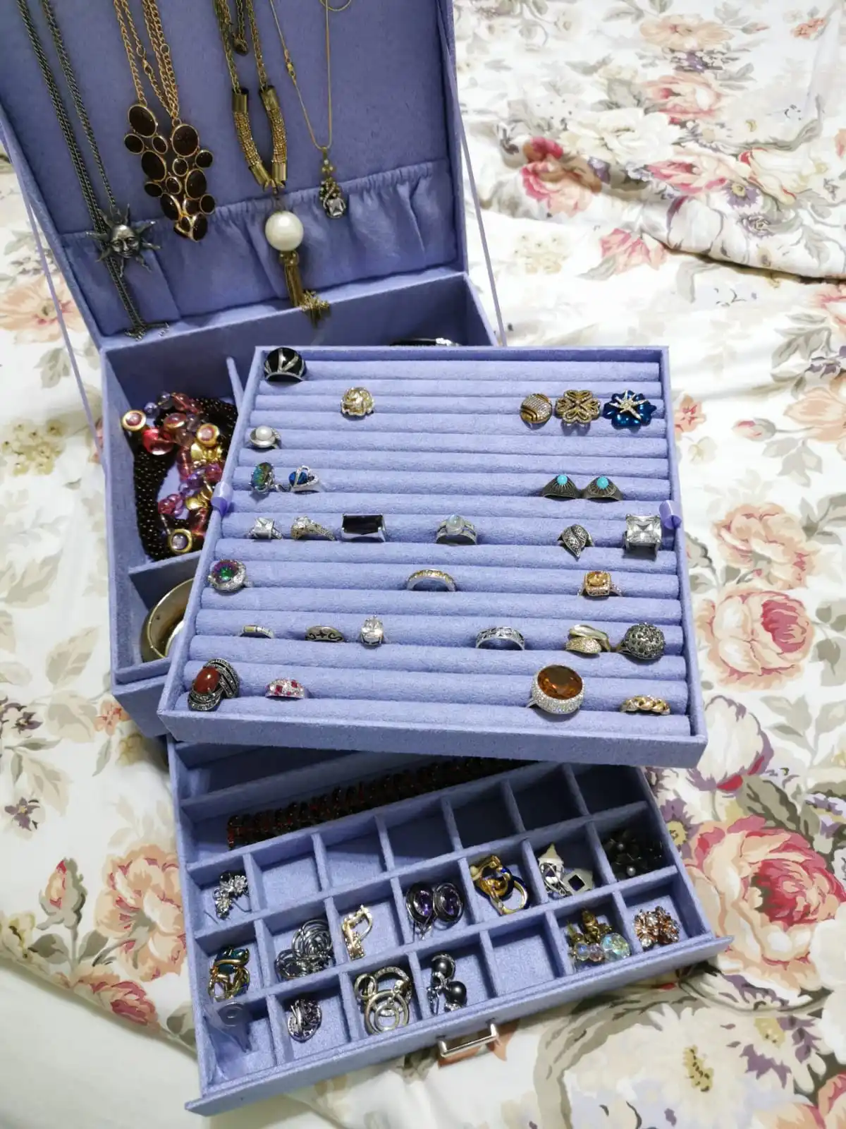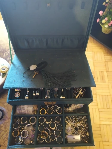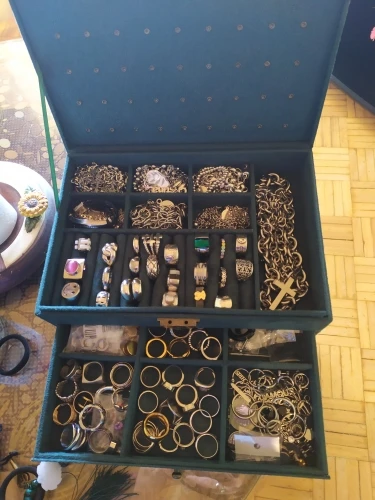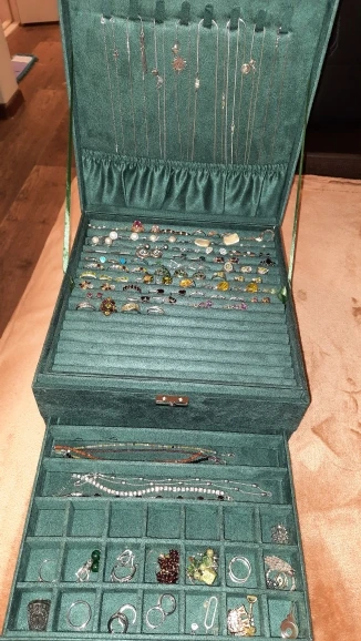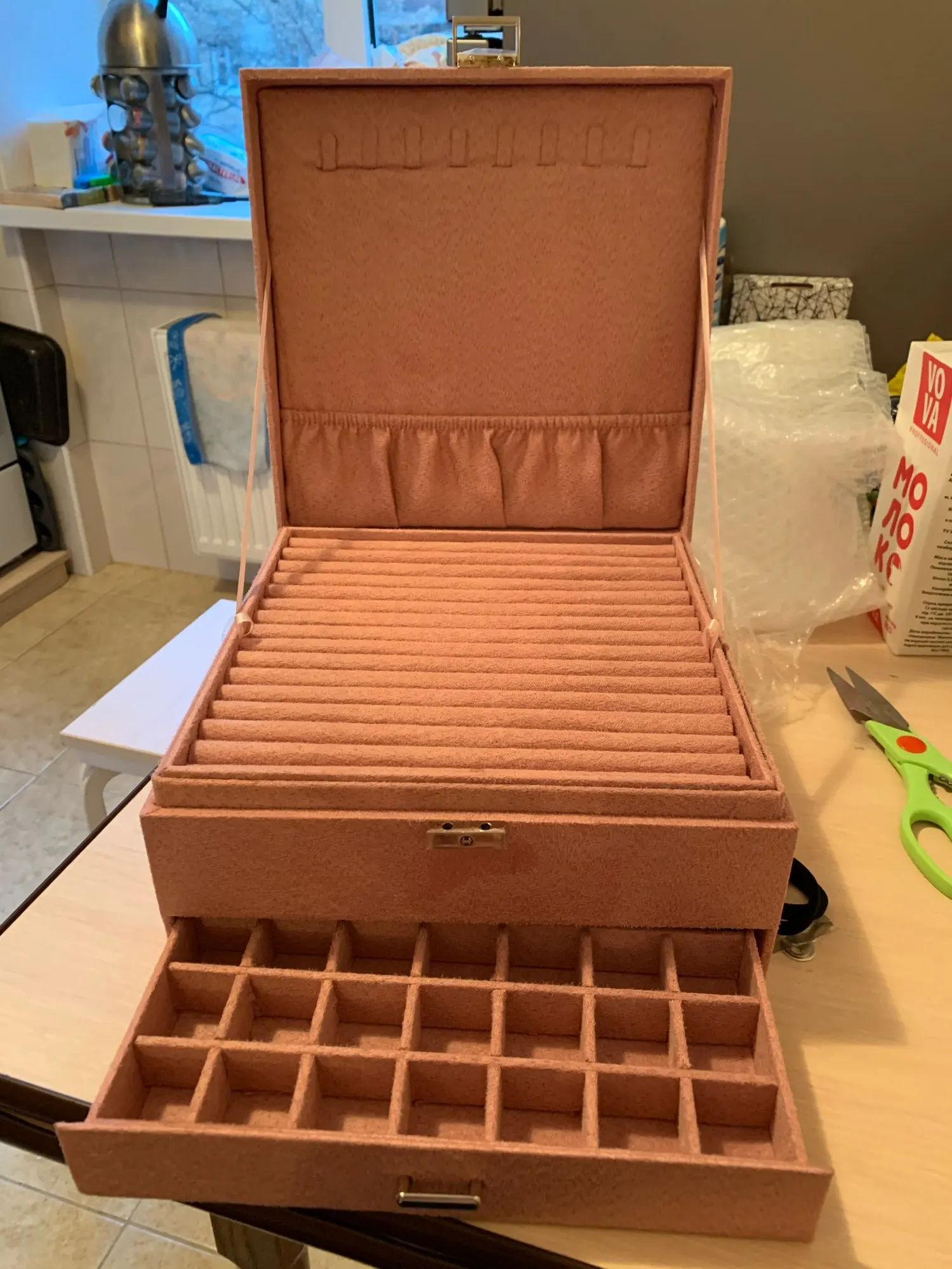 Шкатулка для украшений очень вместительная и может хранить много ювелирных изделий. Материал-не лучшее качество, бархат не ощущается роскошно. Но это делает свою работу, особенно за эти деньги.