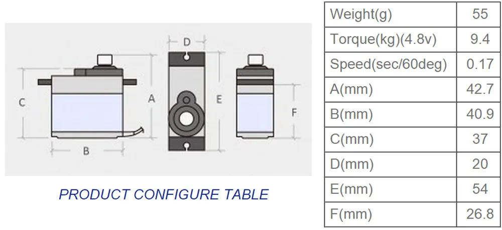 Размеры: 40,7 × 19,7 × 42,9 мм Крутящий момент: 9,4 кг/см (4,8 В); 11 кг/см (6 в) Рабочая скорость: 0.17 сек/60 градусов (4,8 В); 0.14 сек/60 градусов (6,0 В) Рабочее напряжение: 4,8 ~ 6,0 В