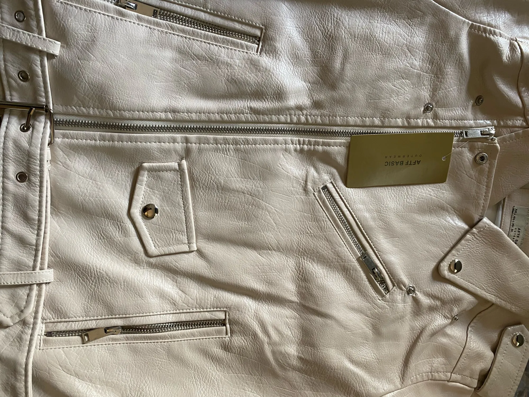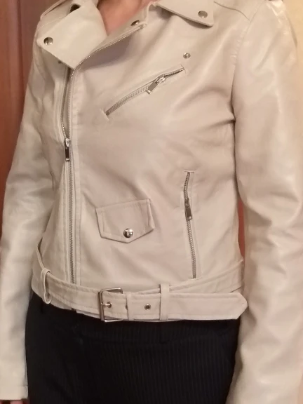 Отличная, качественная курточка. Цвет как на фото - холодный беж. Кожа матовая, без дешёвого блеска. На ОГ 80, ОТ 64 и рост 163см S подошла идеально.