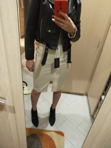 Выглядит очень достойно, без ниток , ровные швы, хорошая фурнитура. Без запаха. Выбрала белую- цвет благородно смотрится. На размеры 89-74-95, рост 165- размер м, до поясницы и вполне можно одеть на водолазку.