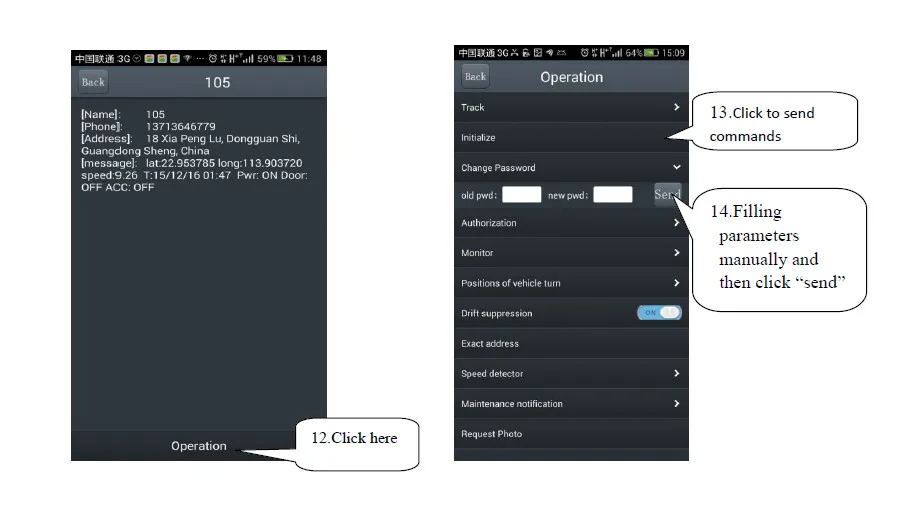 -Вы можете отследить/отменить трек, изменить часовой пояс терминала, рычаг/рычаг, установить превышение скорости/движущийся сигнал тревоги, остановить двигатель/продолжить двигатель и вернуться в режим SMS.