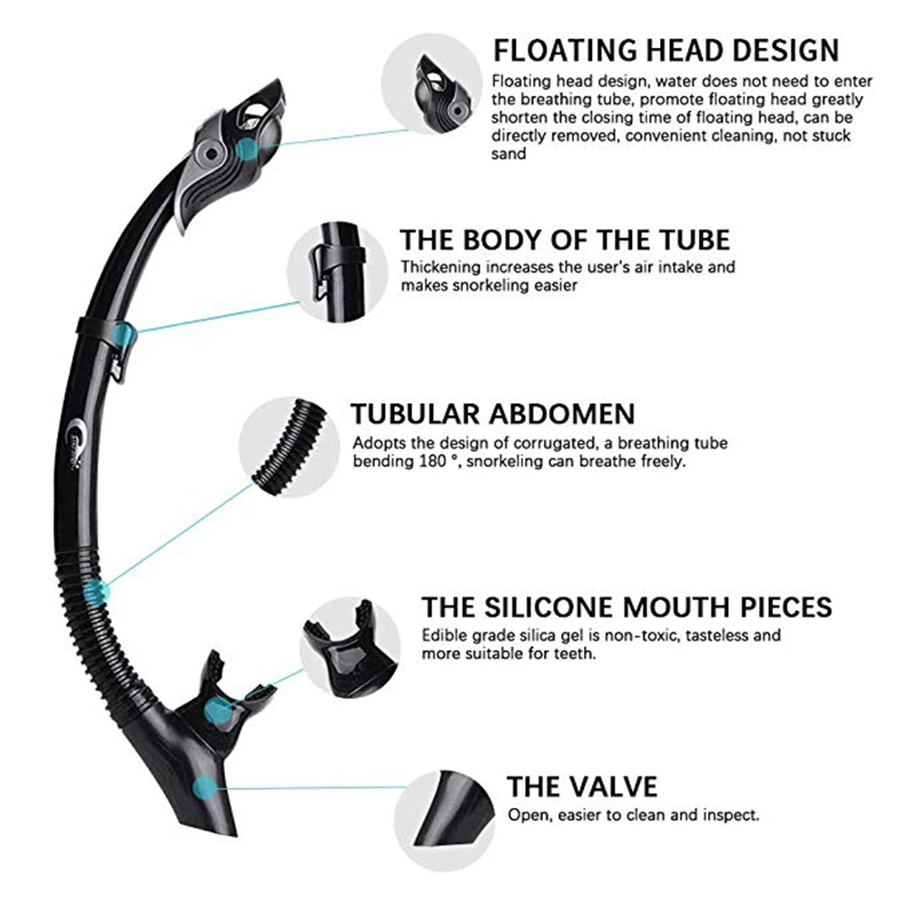 Силиконовая трубка для подводного плавания • Низкопрофильный клапан автоматически уплотняет при спуске, чтобы создать действительно 100% сухой Шноркель• Контурная бочка уменьшает Водонепроницаемость и уменьшает усталость челюсти• Хранитель храпа обеспечивает ремешок для маски на месте• Силиконовый продувной клапан для легкого слива
