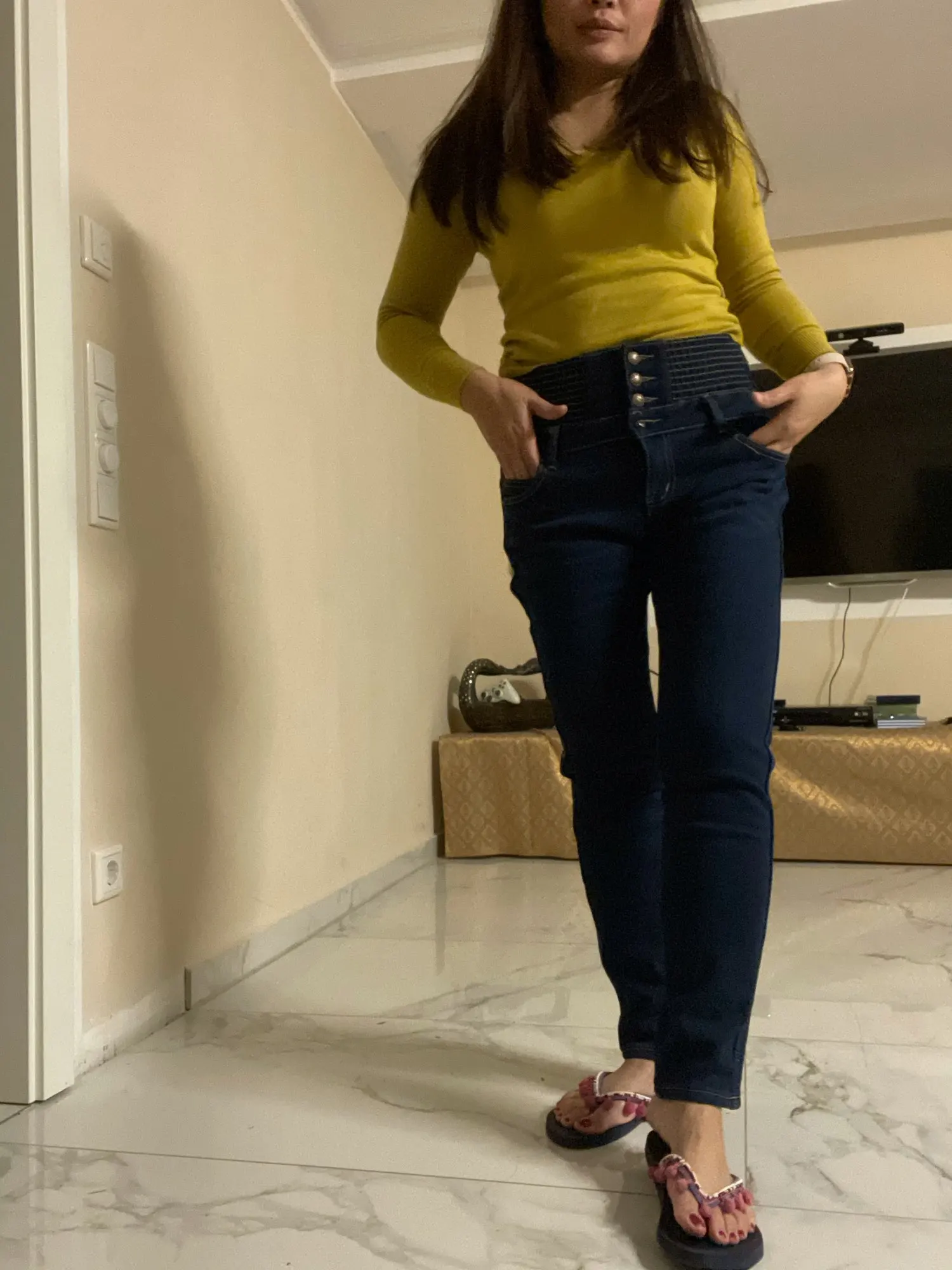 джинсы : ткань мягкая , приятная к телу , минусы их намного больше - на мой рост 160см. короткие длинна по щиколотку(короче чем на фото ) , талия очень, очень широкая . взяла размер 33 в ногах узковато , в бедрах нормально (свободно) , талия очень широкая ( вшивала 10см).