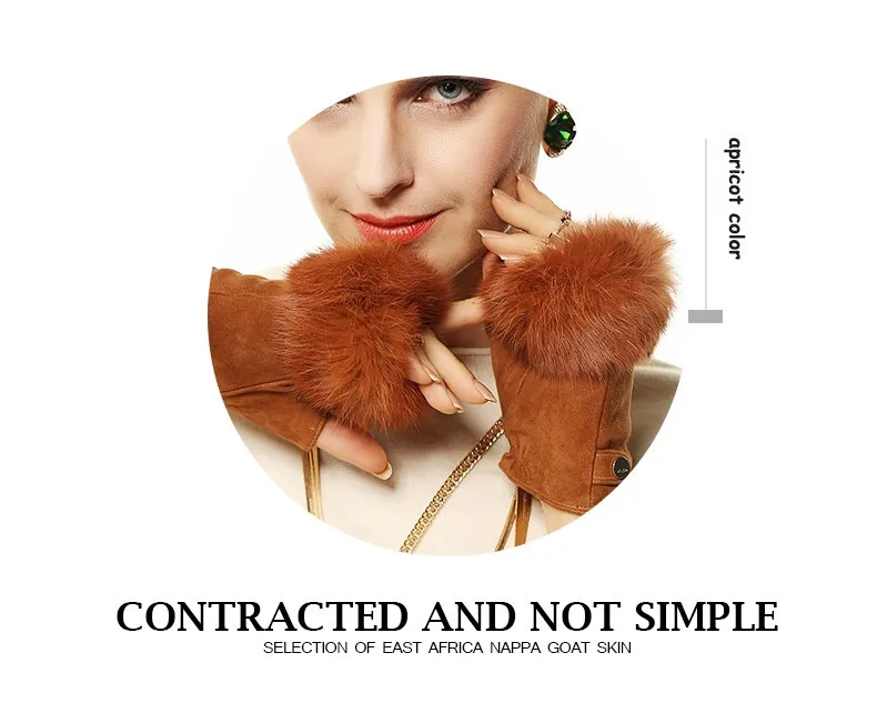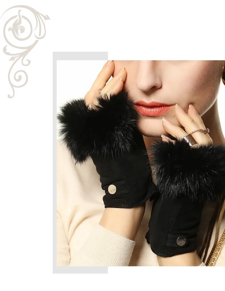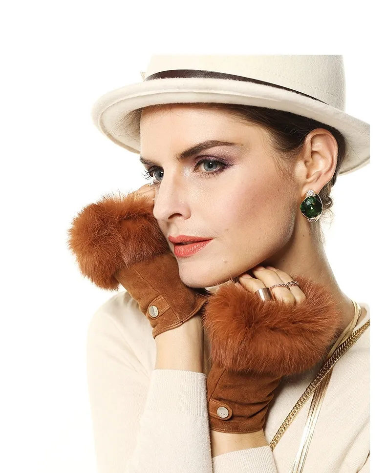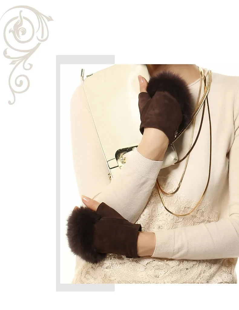Модные зимние замшевые перчатки без пальцев с кроличьим мехом из свиной кожи, однотонные женские перчатки из натуральной кожи на запястье для вождения EL019NC