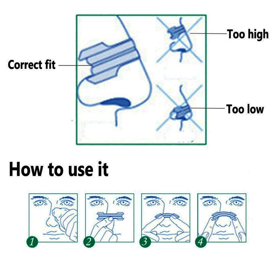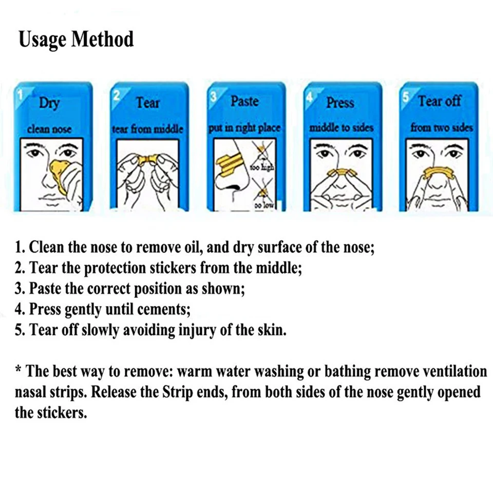 1) чтобы получить максимальные результаты, пожалуйста, правильно разместите полоску.2) только для одного использования. Не используйте более 12 часов.3) не для детей до 5 лет.4) Не используйте при язвах, солнечных ожогов или раздражении кожи.5) Если возникает сыпь или раздражение кожи, прекратите использование.· Размер важен --- получите правильный размер для максимальной выгоды.· Средний размер: 55 мм x 16 мм (подходит для 75% взрослых носы.)· Большой: 66 мм x 19 мм (для взрослых с большим носом)