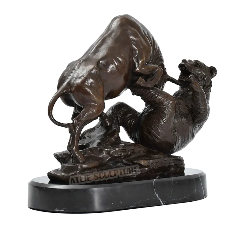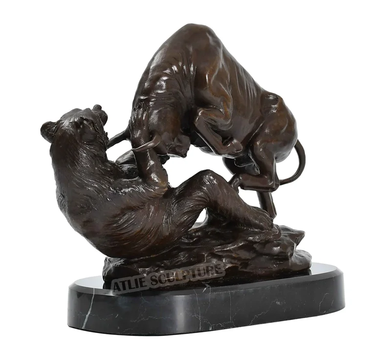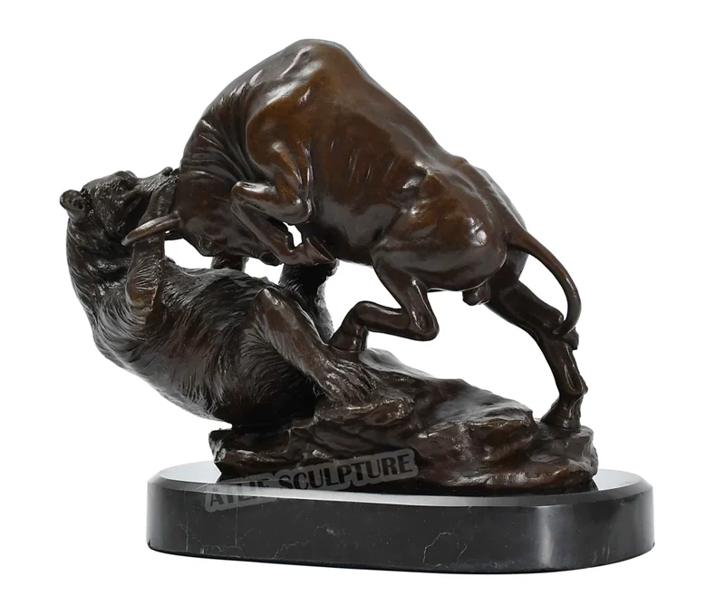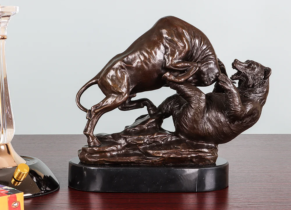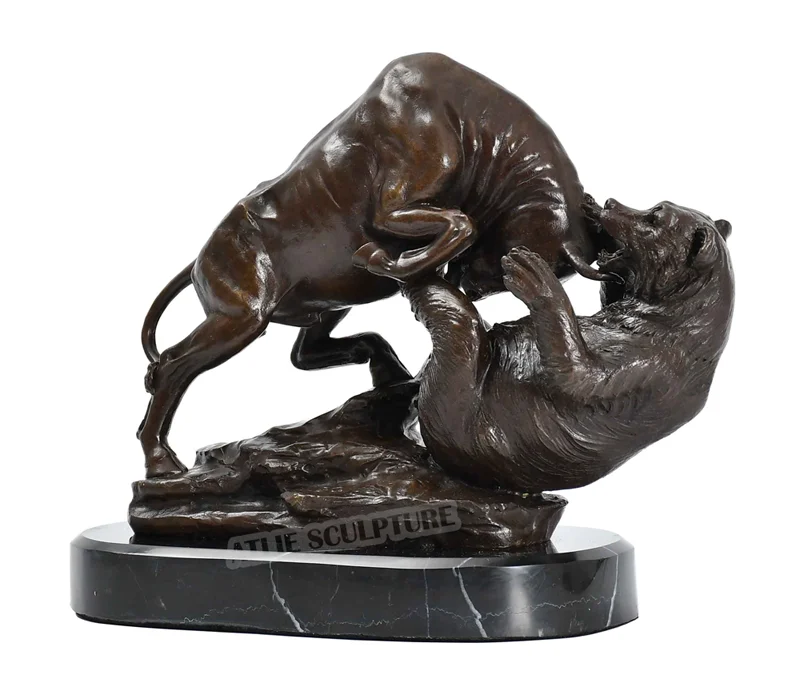 Винтажный фондовый рынок Bull VS Bear скульптура-это настоящее произведение искусства. В нем изображен бык, прижимающий медведя рогами. Эта боевая Статуэтка медведя быка-это классический бой на Уолл-стрит, и теперь ее можно запечатлеть на столешнице вашего стола и навсегда восхищаться запятнанной бронзовой статуей фондового рынка. Эта классическая Статуэтка «бык против медведя» крепится на мраморной основе.