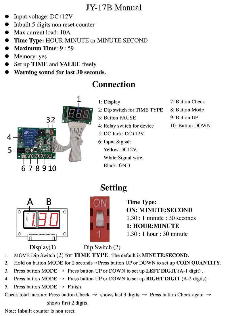 * Новейшая версия программного обеспечения* Это используется для контроля времени источника питания* Можно использовать с акцептором монет или другими устройствами, которые могут выводить импульсные сигналы. И вы можете настроить значения для запуска вашей машины* Подходит для любых устройств автоматического управления, таких как игровые автоматы, массажные кресла, обувные полировщики, стиральные машины, зарядные устройства, сушилки и шт.