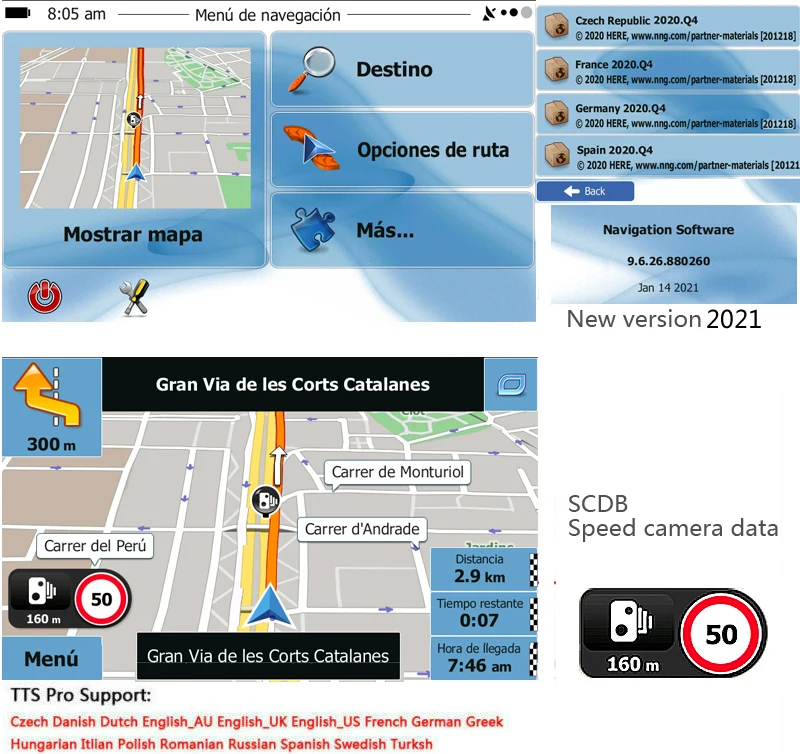 Навигационное Программное обеспечение поддерживает язык s и язык голосового руководства:Английский (AU), английский (UK), английский (Us), каталанский, чешский, хорватский, датский, голландский, английский, финский, французский, немецкий, греческий, венгерский, итальянский, латвийский, литовский, норвежский, польский, португальский, румынский, сербский, словацкий, словенский, русский, испанский, турецкий, арабский, шведский, тайский, румынский, индонезийский, сербский, Зулу; Африкаанс; болгарский; Россия; Украинский; Албания; Персидский, малайский