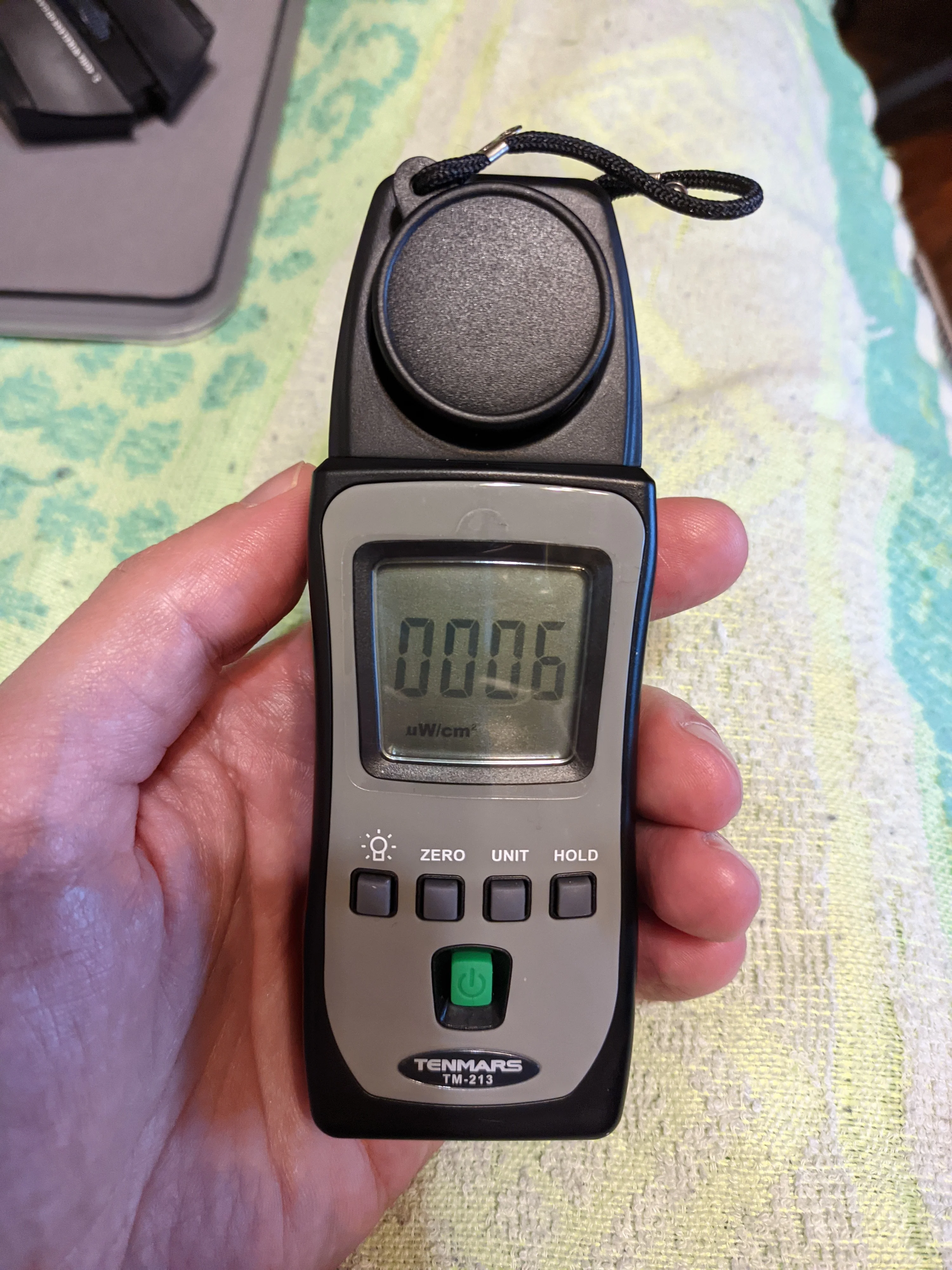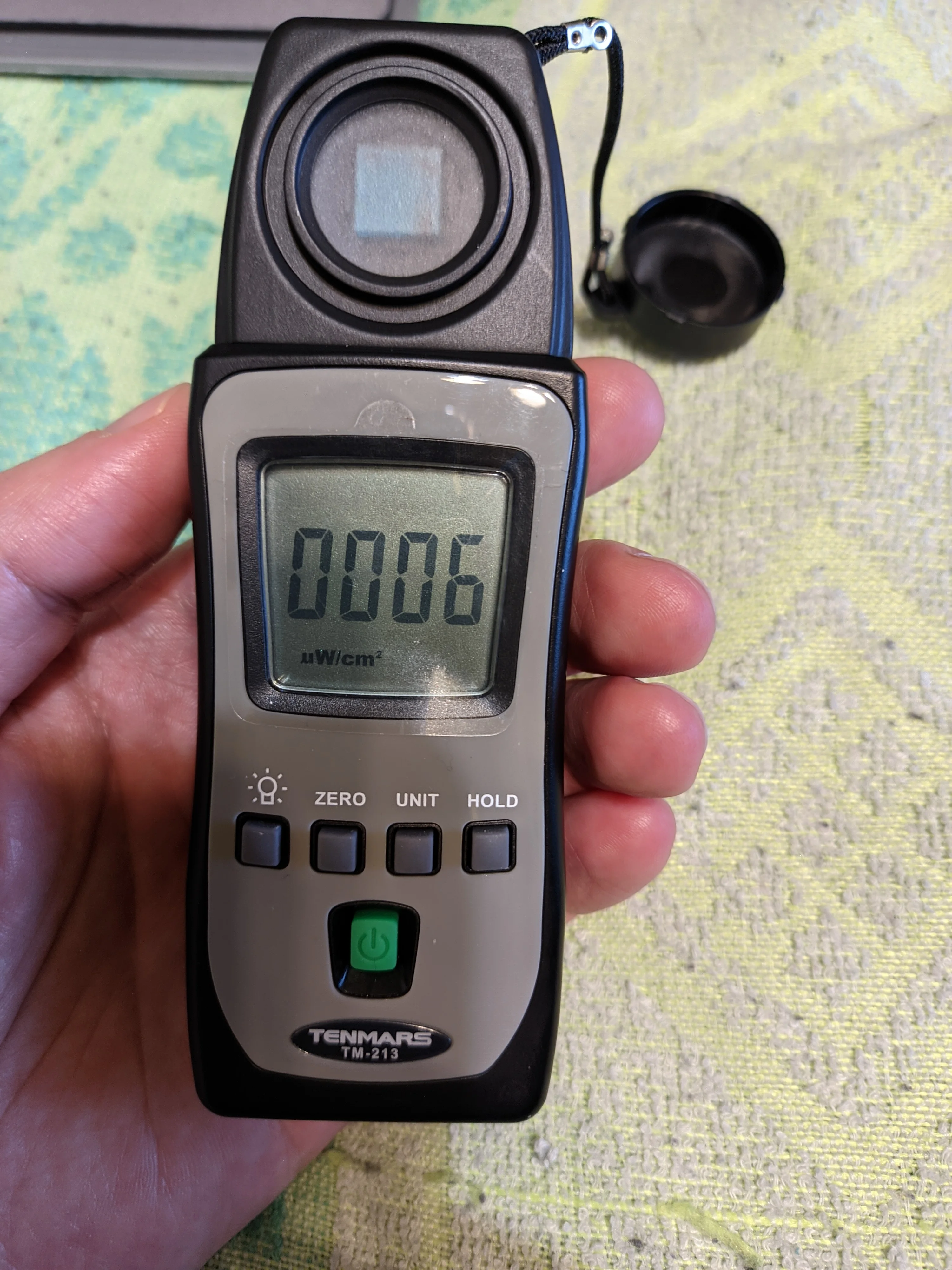 Хороший измеритель ультрафиолета. Солнце пока не измерял, погода не позволяет, облачное небо показывало до 400 мкВт/см2, через оконное стекло 120 мкВт/см2. LED телевизор, светодиодные лампы и фонарь ничего не излучает в диапазоне ультрафиолетового излучения. Удобный и крепкий чехол в комплекте, прибор хорошо в нём сидит и легко вынимается из него. Инструкция на английском и на китайском, также в коробке лежал сертификат, что прибор настоящий, а не подвальный. В полной темноте показывает 5-6 мкВт/см2, но это в пределах погрешности, пробовал его откалибровать с помощью кнопки ZERO, но не разобрался как она работает, нажимаешь её, показания обнуляются, нажимаешь повторно, значения 5-6 мкВт/см2 возвращаются обратно в условиях полной темноты с закрытой крышкой. Подсветка автоматически выключается через несколько секунд. Рекомендую!