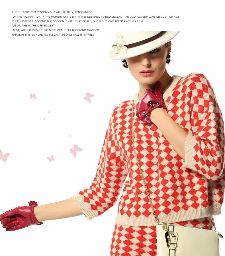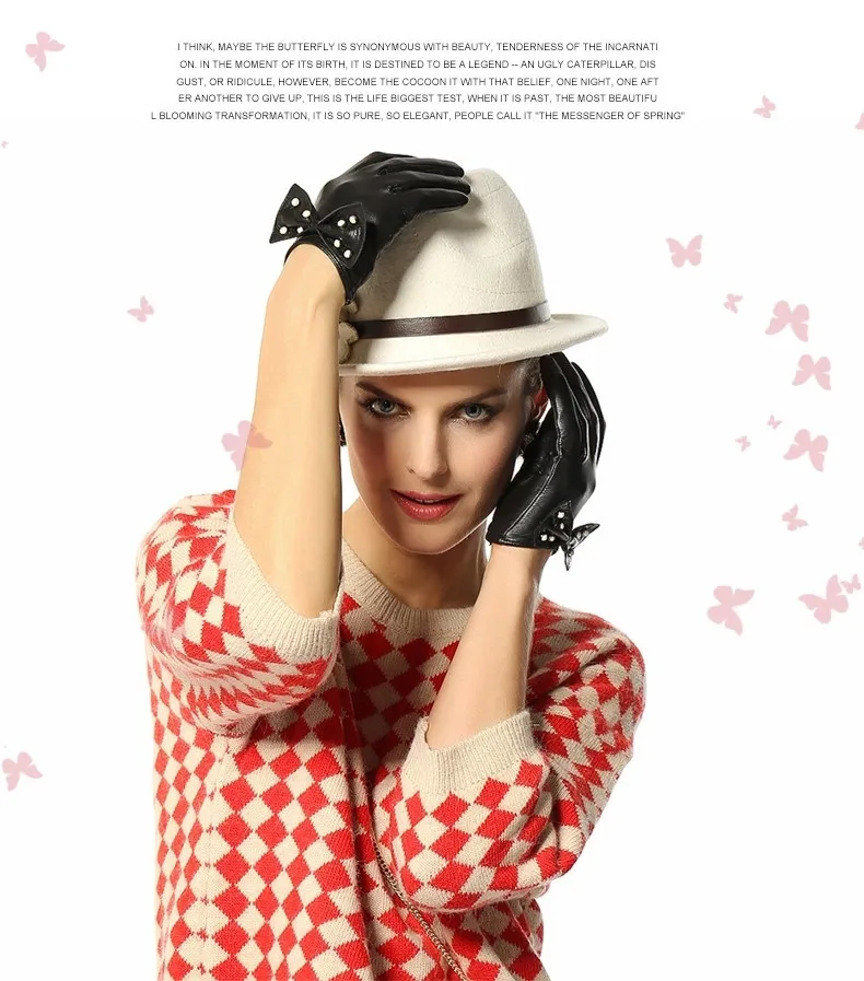 Женские перчатки из натуральной кожи, тонкие женские перчатки из овечьей кожи с бантом на запястье, модные однотонные перчатки для вождения из овечьей шкуры L119NN