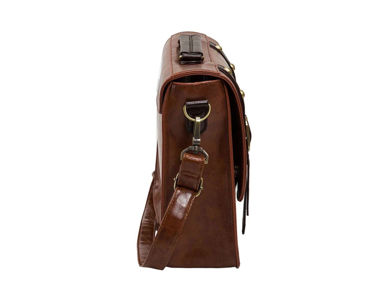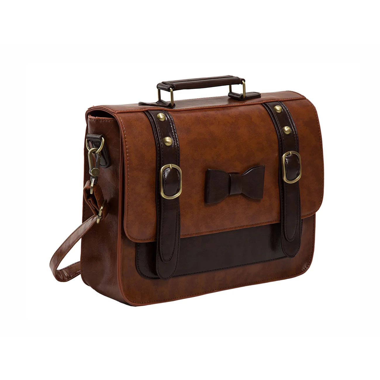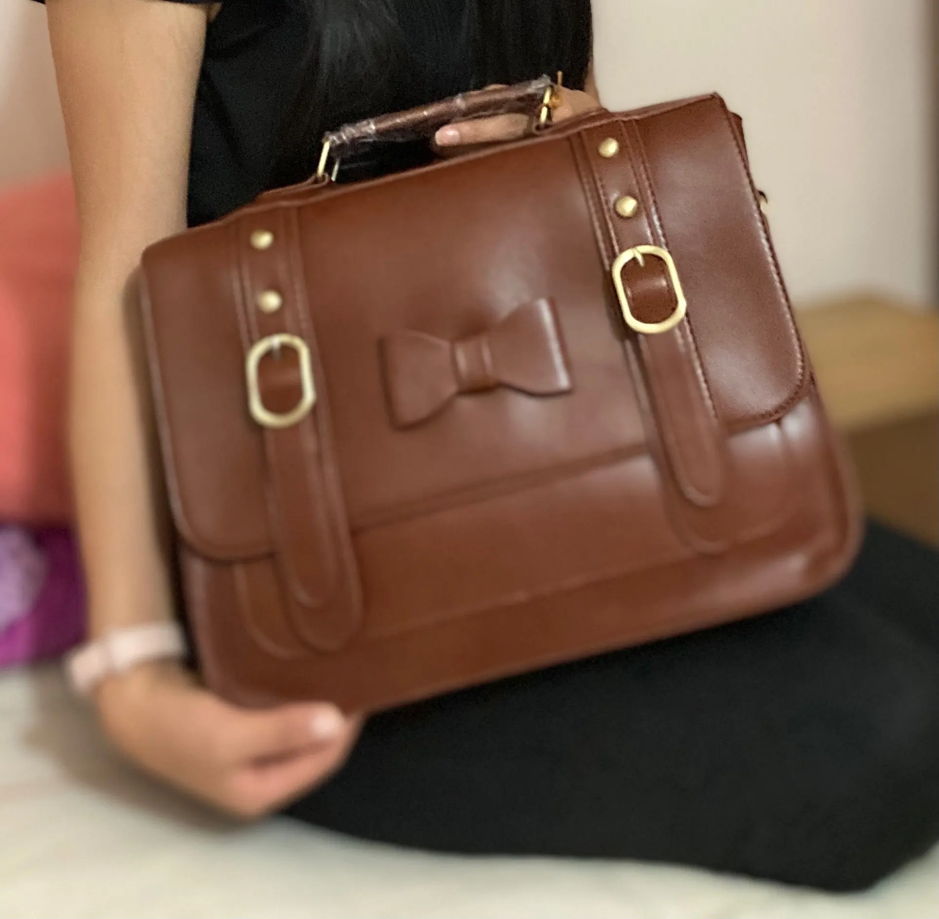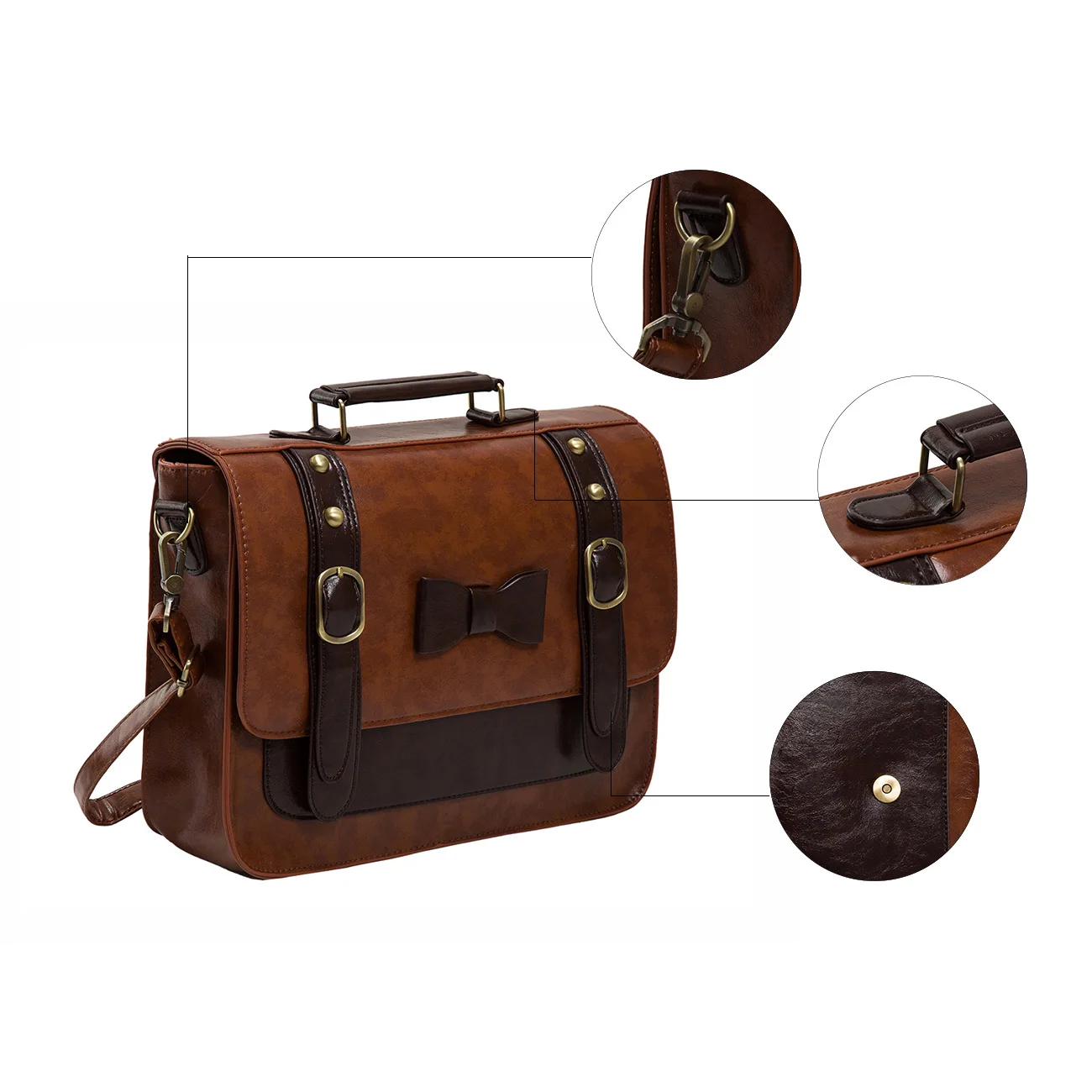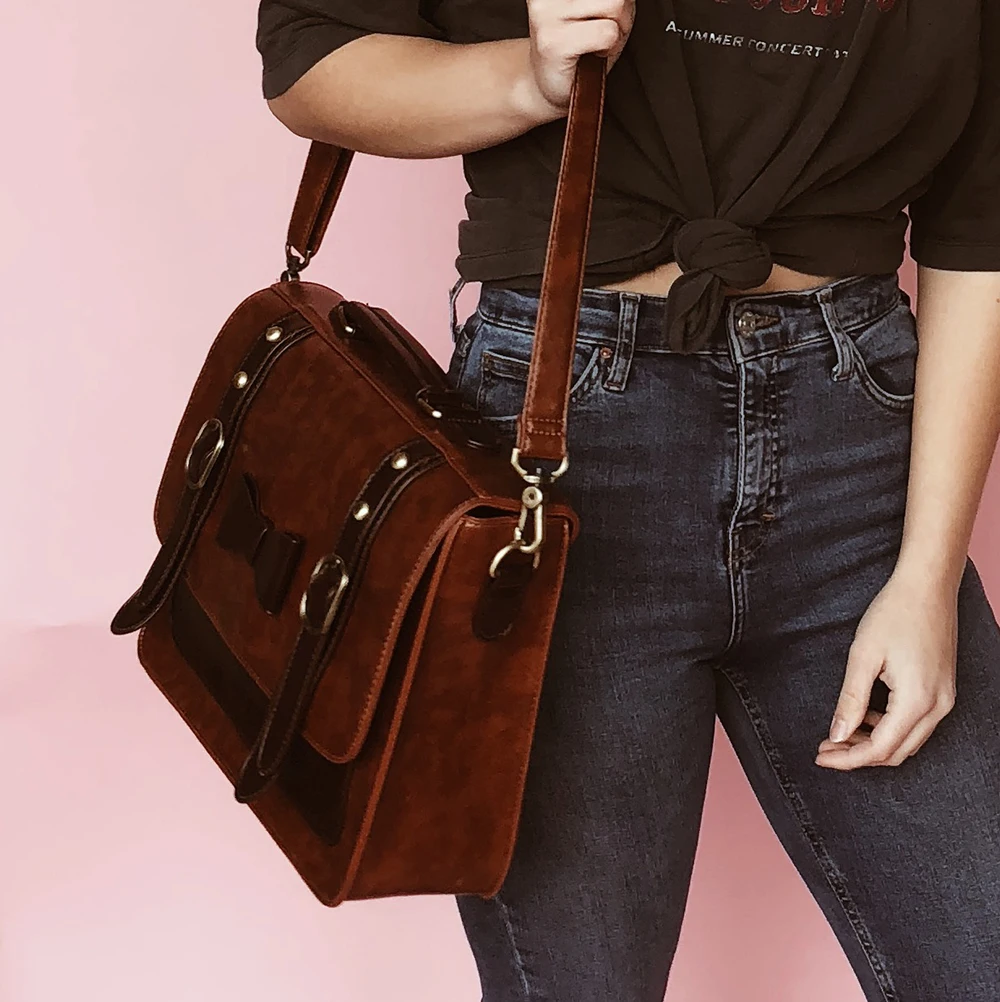 Материал: из искусственной кожи с прочной верхней ручкой и винтажной бронзовой фурнитурой, легко носить с собой.