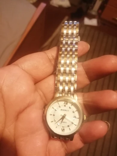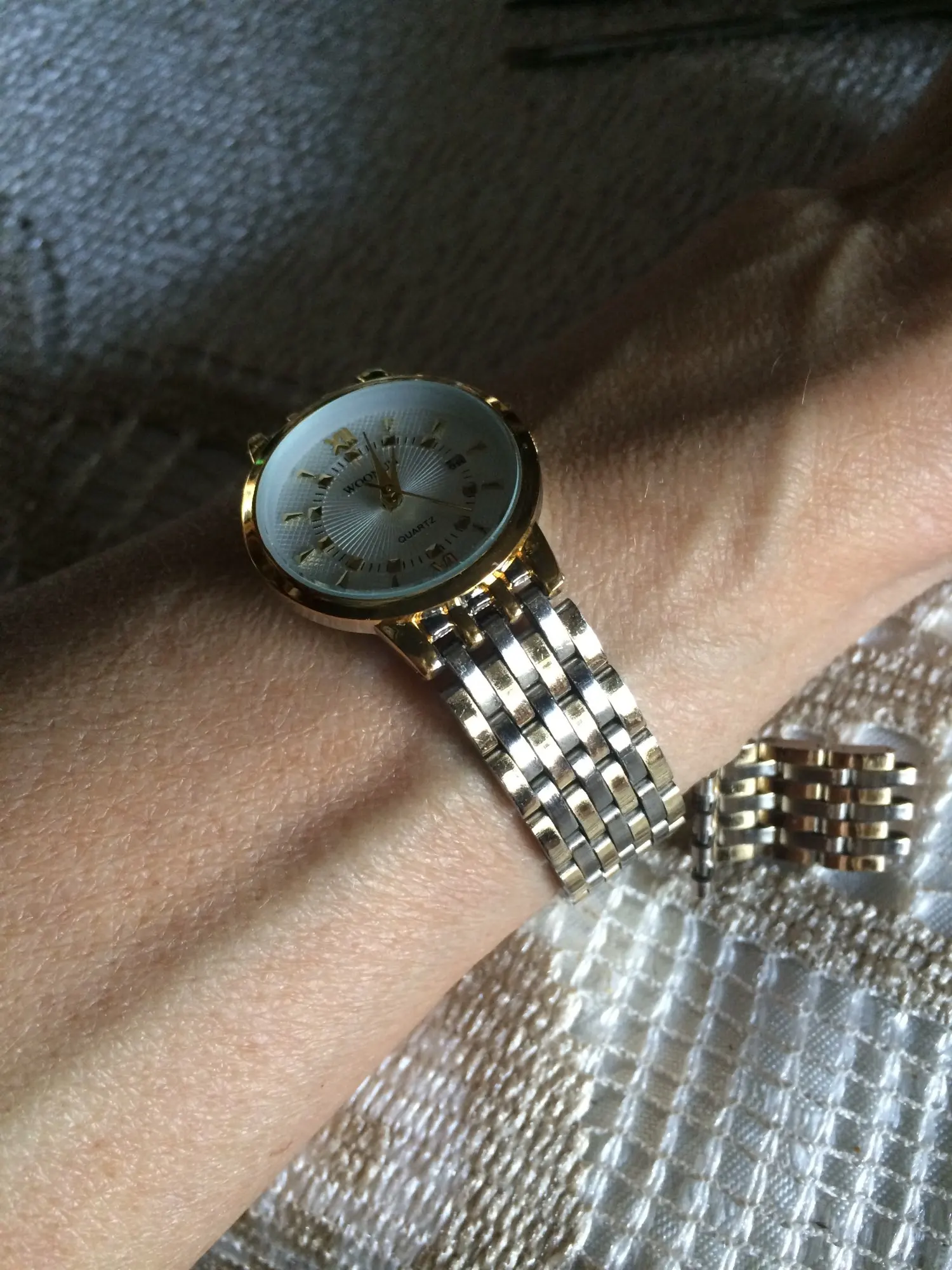 Хорошие часы, выглядят симпатично, но достаточно легкие. На руку 17 см пришлось убрать все дополнительные звенья, которые можно снять. Немного не симметрично располагается замок, чуть смещен в одну сторону, т.е. по хорошему звенья надо было убирать 3 и 2 с другой стороны, но пришлось снять все. Показывают дату. В целом довольна покупкой.