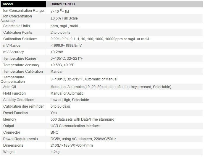 Bante931-NO3 прецизионный Настольный цифровой нитрат ионометр с ионным диапазоном 0,4 ~ 62000ppm