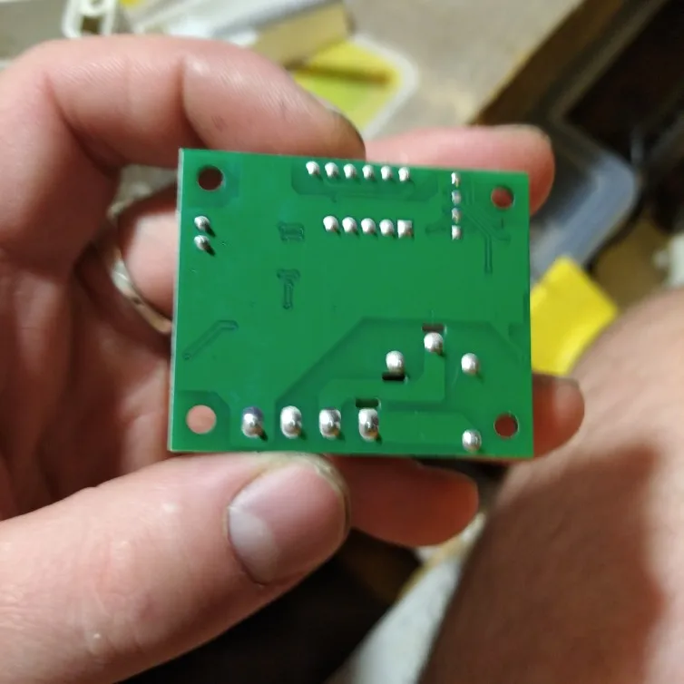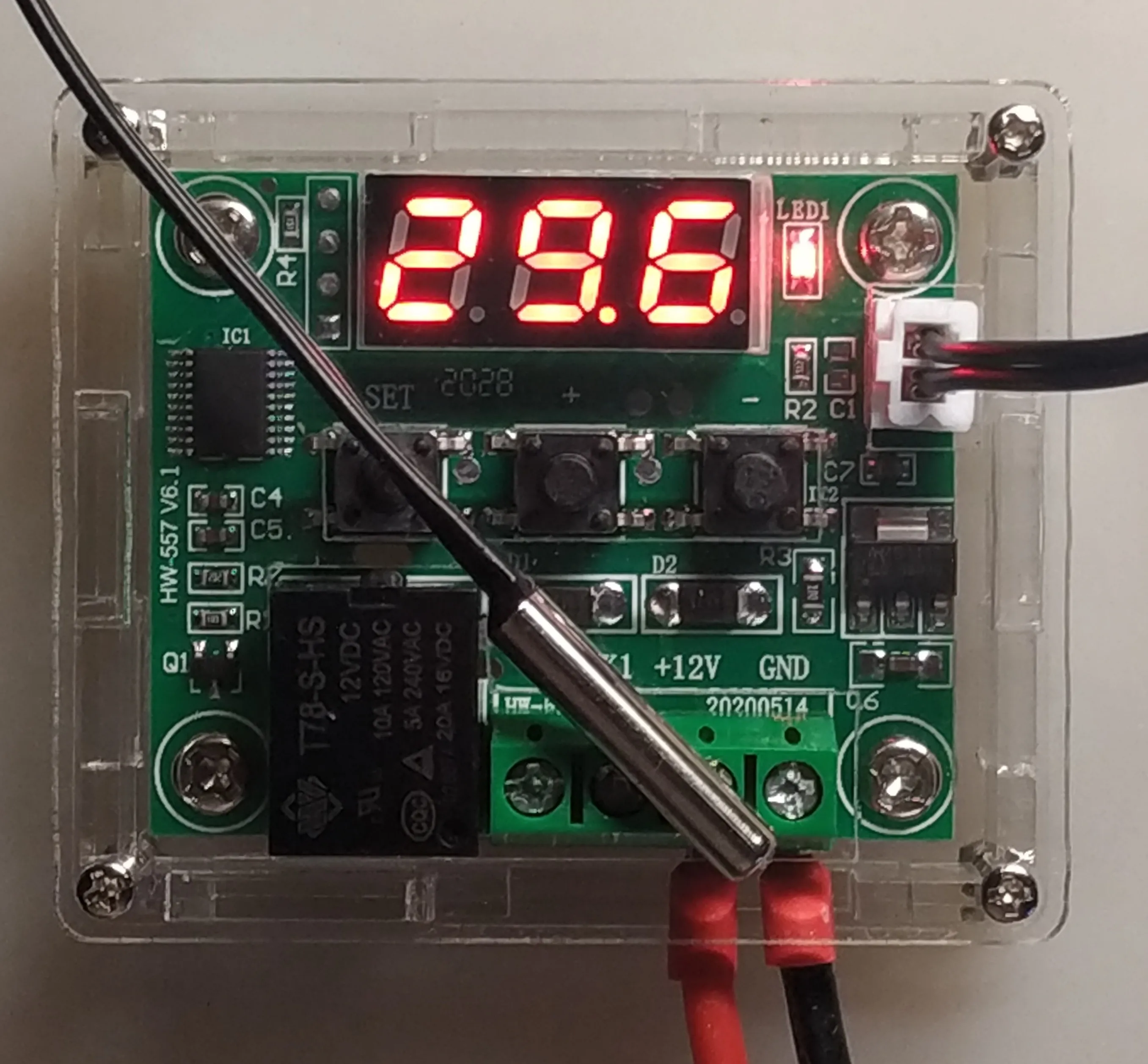 Терморегулятор работает нормально. Входит в настройки, по клавише SET, длинное нажатие. На плате стабилизатор напряжения AMS1117, на 5 вольт, делает из 12 вольт питания. Реле на 12 вольт 5А 240В, и 20А 16В (по крайней мере на нём так написано). Думаю что можно переделать на питание 5 вольт от USB, выпаяв стабилизатор, и поменяв реле на 5 вольтовое. Корпус сделал из пластиковой бутылки, её донышка, прикрутил прямо к блоку питания.