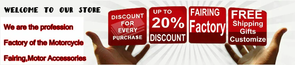 -По поводу печатиС 3 слоями рисунка, чтобы обеспечить лучшее время жизни. Два прозрачных пальто + наклейки, если вам нужен Неокрашенный обтекатель будет дешевле.-О СтильМы делаем любые виды фабричного стиля или пользовательского стиля для вас! У нас есть собственный производитель наклеек, мы можем сделать любой логотип бренда и даже логотип вашей компании!-Оригинальные гоночные обтекателиМы можем предоставить Заказные услуги гоночного обтекателя для любого вида обтекателя мотоцикла. Мы закроем Фару и заднее сиденье обтекателя и напечатаем на нем свой собственный гоночный номер, чтобы вы могли ездить на этом обтекателе на трассе. И эта услуга бесплатна!-ПрименимостьВсе Обтекатели предварительно просверлены, и все отверстия могут Выстроиться на вашем велосипеде, компрессионное формование: 95% подходит, дешевле. Мы предлагаем вам попросить профессионала установить его.Литье под давлением: 100%, дорогой.