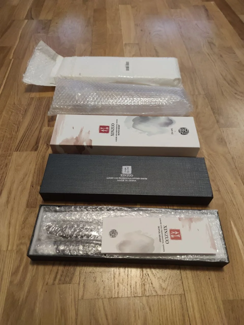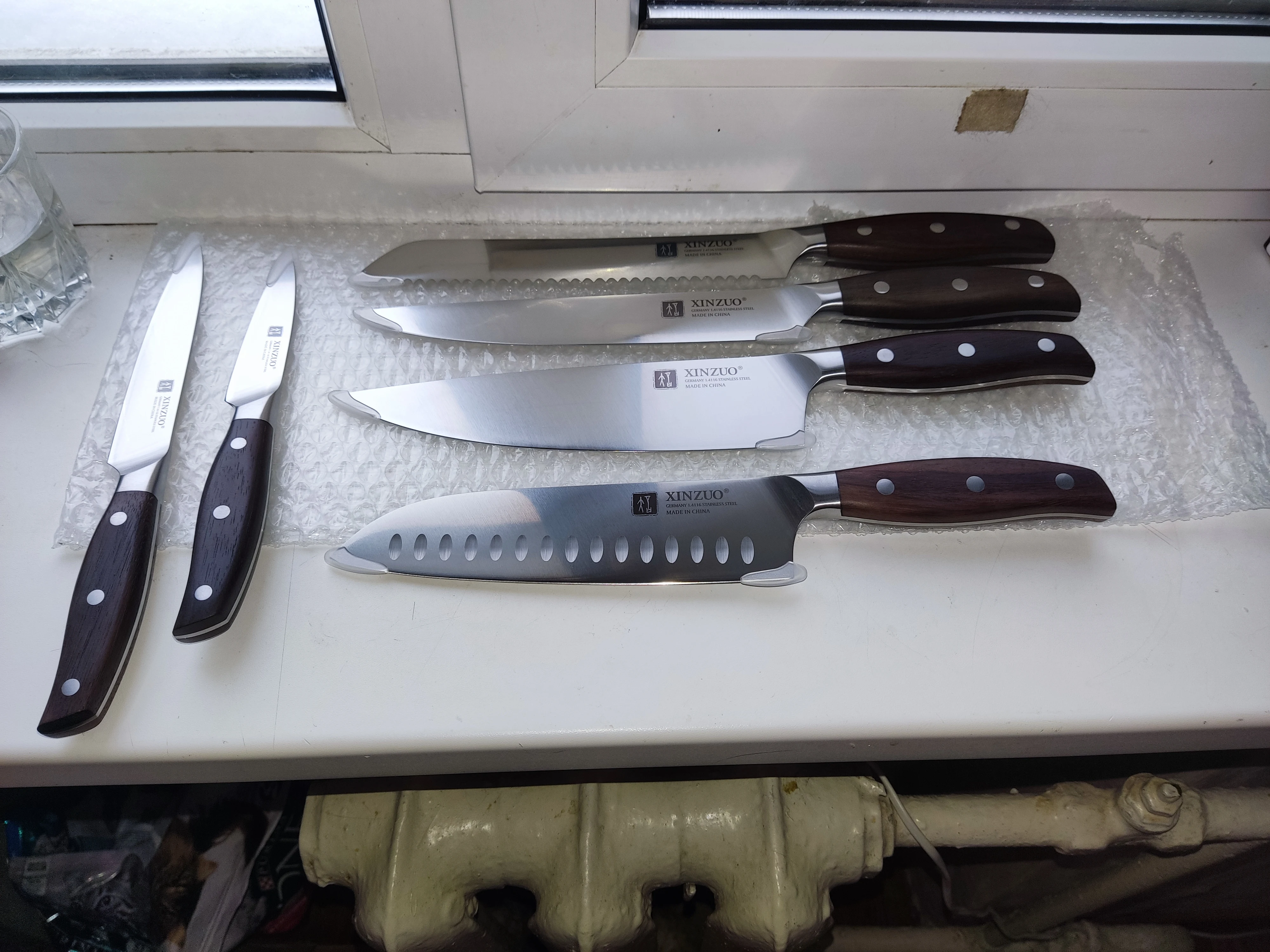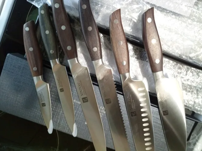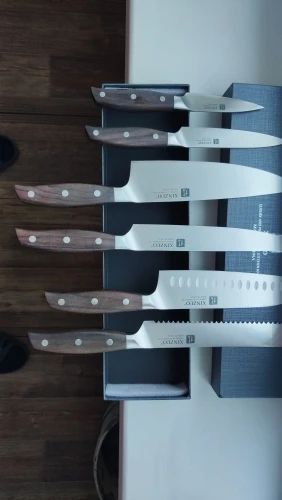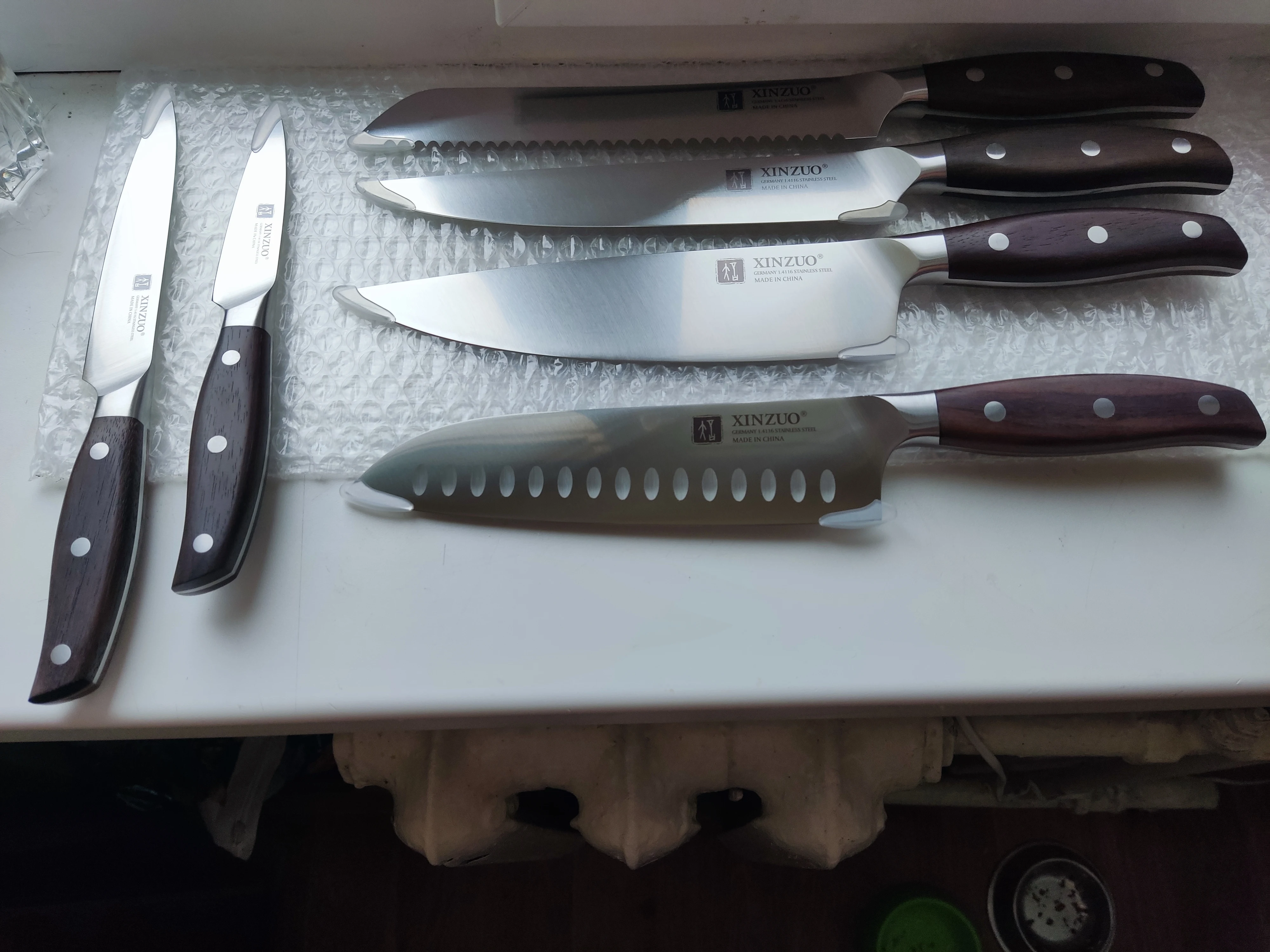 Прекрасные ножи. Сталь упругая, для изгиба нужно приложить серьёзное усилие. Острые из коробки. Ручки деревянные, не круглые, поэтому очень хорошо лежат в руке. Упаковка в 10 слоёв, всё в воздушной плёнке, каждый нож упакован индивидуально. Доставка очень быстрая - около 5 дней в Петербург. Обсмотрелся обзоров - эти ножи хвалят все, включая ножевых гиков. Взял чуть меньше чем за 5000, очень доволен. Для заточки взял мусат того же бренда XINZUO, он в пути из Китая.