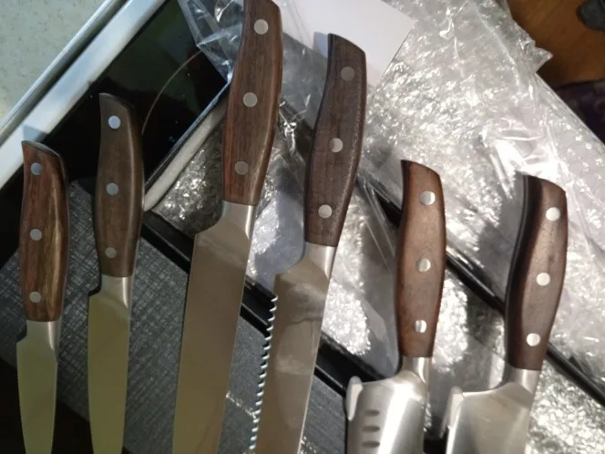 Взял набор из 6 ножей из немецкой стали 1.4116. Хорошая упаковка(ни чего не помялось), быстрая доставка. Сами ножи огонь, режут так что даже не надо прилагать ни каких усилий, в продукты входят как разогретый нож в масло. Жена в первый же день порезалась, слава богу не сильно. Нож для хлеба вообще чудо, разрежет любой самый мягкий хлеб, ну типа чаабатты. Эти ножи стоят своих денег, Продавцу огромный респект.