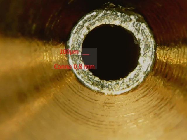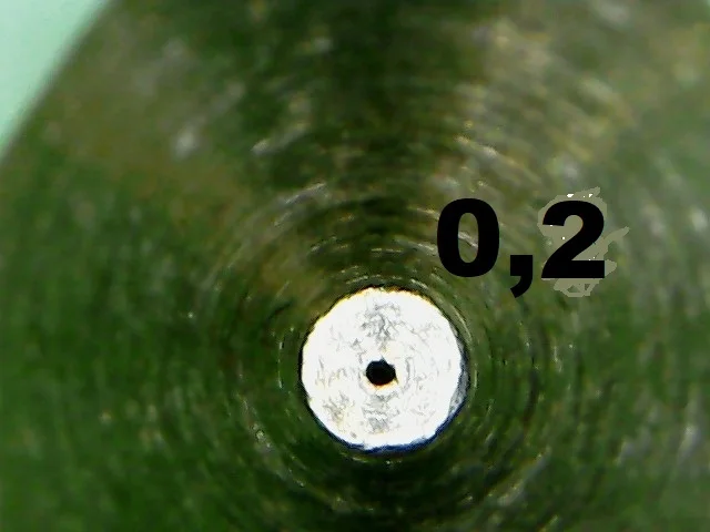 Пришло за 25 дней. Качество в принципе приемлемое, ещё не печатал. За 48 грн(1.66$) 10 штук - это просто супер! Замерял настоящий диаметр на микроскопе, расхождение в цифрах можете увидеть на фото: чёрные - заявленный, красные - измеренный. У насадок от продавца Triangle Lab гораздо аккуратнее отверстия и шлифовка, но сам диаметр отверстия тоже бывает гуляет, так что смотрите сами.