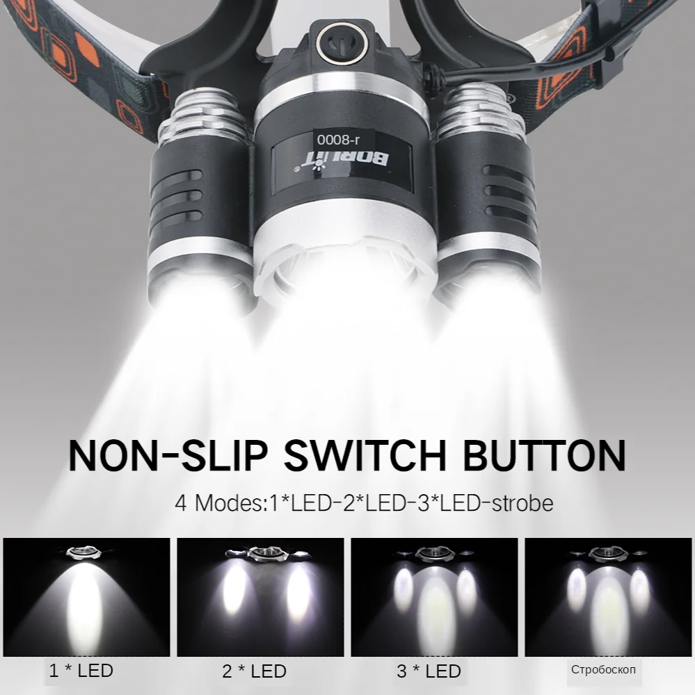 BORUiT RJ-3000 XM-L2 мощный налобный фонарь 3000лм 4 режима налобный фонарь Перезаряжаемый 18650 Водонепроницаемый налобный фонарь для рыбалки охоты