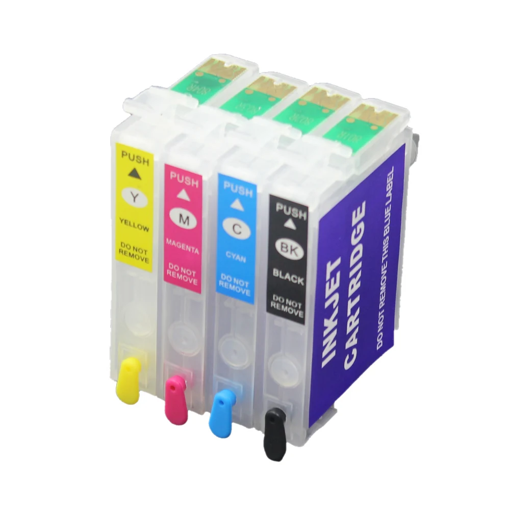 Легко заправлять! Никогда не иссякнут чернила! Экономьте деньги! Пустые многоразовые картриджи с ARC «ЧИПАМИ автоматического сброса». Без губки, чтобы собрать остатки поролона, заправка-это ветерок. Все, что вам нужно сделать, это удалить резиновую вилку в верхней части тележки, впрыснуть чернила до полного, положить резиновую вилку обратно на место, сбросить чип, и вы готовы к отправке. Больше не сражайтесь с пеной, чтобы получить хороший образец сопла. Эта тележка будет напечатана идеально каждый раз и может быть повторно заполнена снова и снова. Именно то, что мы всегда хотели. Номер картриджа T0711-T0714 с новейшими ЧИПАМИ автоматического сброса "ARC" Совместимость для использования на принтерах: