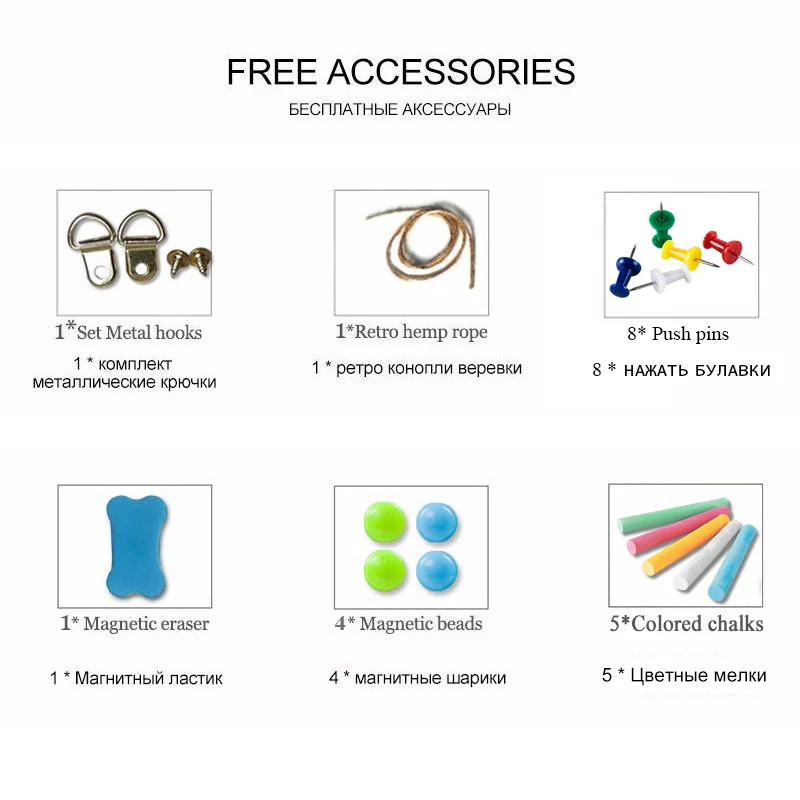 Цветной мел * 5/магнитные кнопки * 4/ластик * 1/кнопки/пеньковая веревка * 1/Крючки * 2/винт * 2Материал лицевой стороны: