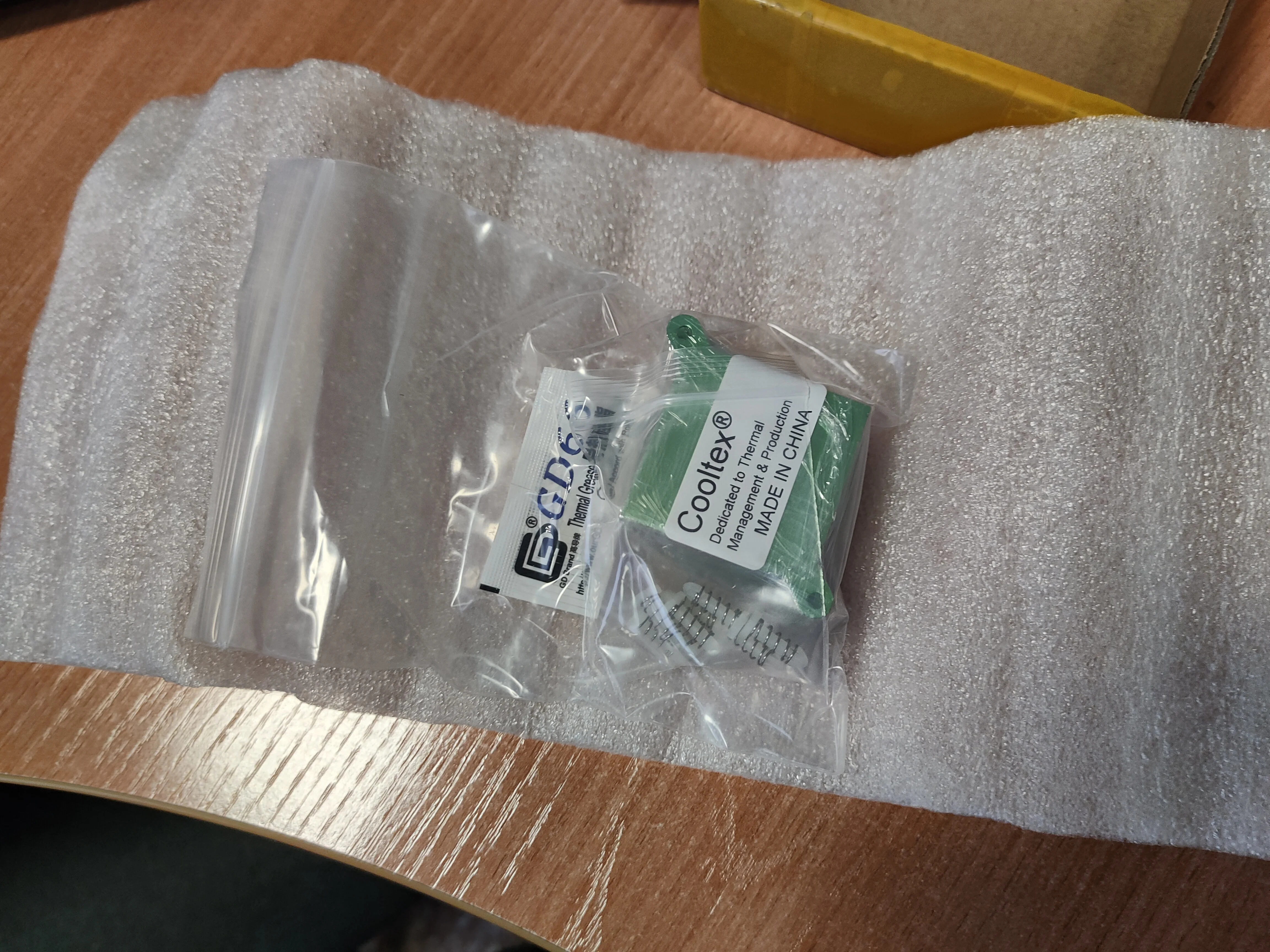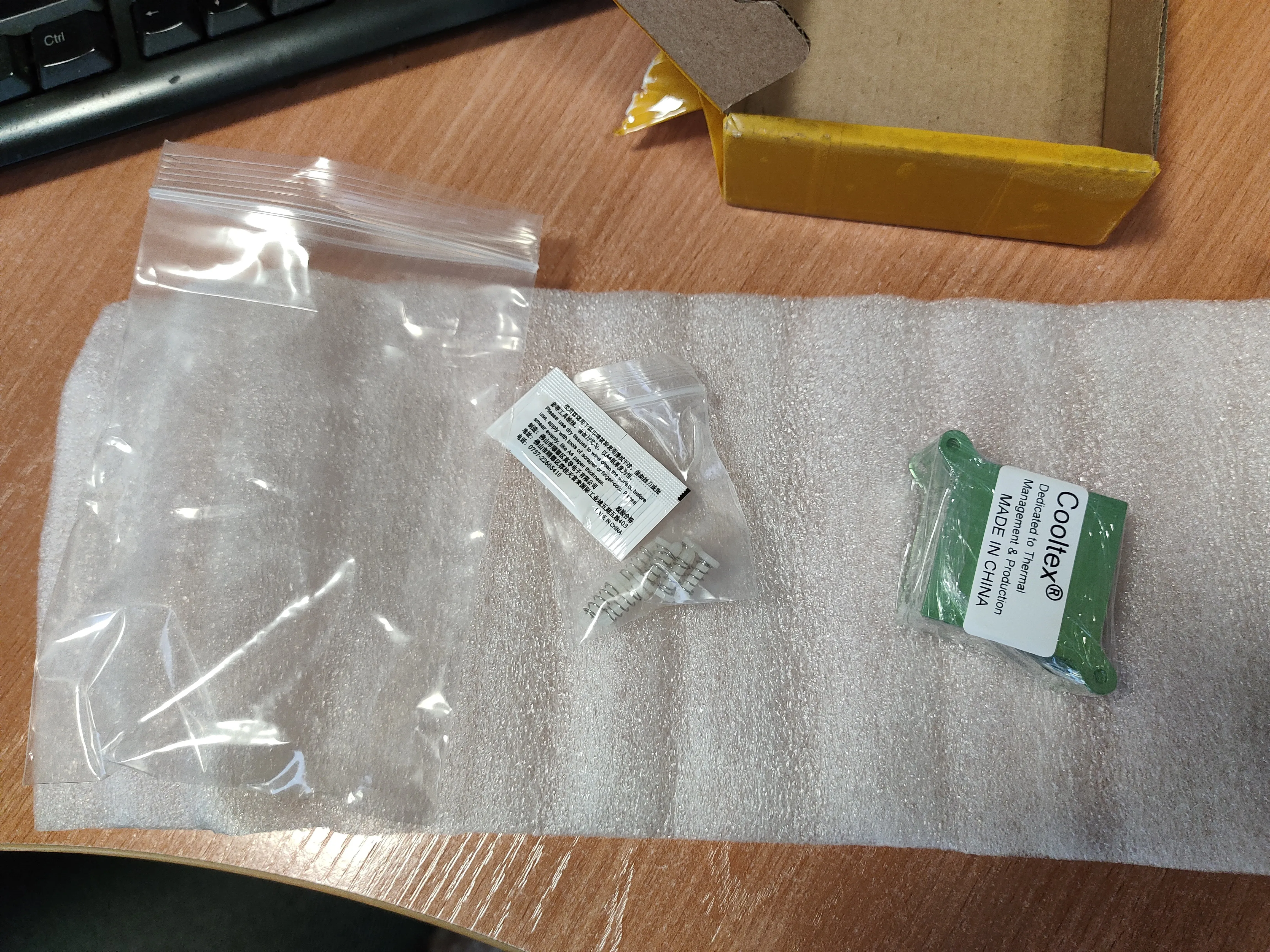 Заказ пришёл за 10 дней, что довольно быстро. Упаковано всё в небольшую аккуратную коробку. В комплекте 4 радиатора, клипсы и термопаста. На нижней стороне радиаторов присутствуют мелкие царапины, но я не считаю это проблемой, потому что это простые радиаторы, предназначенные для охлаждения мостов на обычных пользовательских материнских платах. Для охлаждения южного моста такого радиатора бужет вполне достаточно.