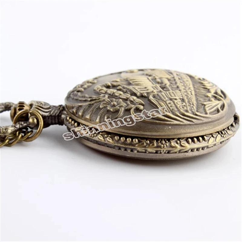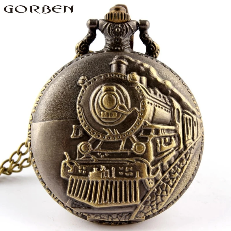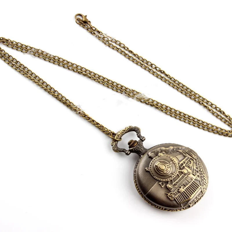 Уникальный бронзовый поезд в стиле ретро, дизайн локомотивного двигателя, ожерелье, кулон, кварцевые карманные часы с цепочкой на брелок, мужские и женские подарки